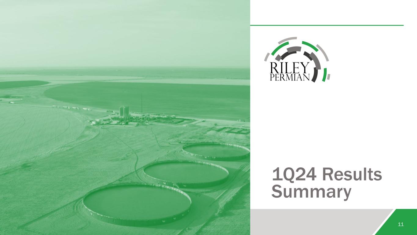 Power Generation Initiatives (Cont’d.) 10 Self-Consume for REPX Operations Sell to the Grid REPX Objectives • Utilize low-cost natural gas for thermal power generation • Improve reliability, powering 100% of Texas operations • Stabilize cost of power for operations • Earn attractive returns on investment capital • Capitalize on market dynamics including abundant, associated natural gas production, gas midstream egress limitations and shortfalls of dispatchable, reliable power • Achieve value uplift for our natural gas sold • Diversify revenue mix and invest in power markets with attractive fundamentals • Earn attractive returns on investment capital Generation Capacity • 20MW • 100% thermal generation • 100MW planned • Mix of thermal generation and battery storage REPX Natural Gas Sold • Up to 3MMcfd • Up to 10MMcfd Status • ~50% operational during 1Q24 • Finalizing installation and testing • Signed definitive documentation in 2Q24 • Conducting siting, permitting and equipment procurement