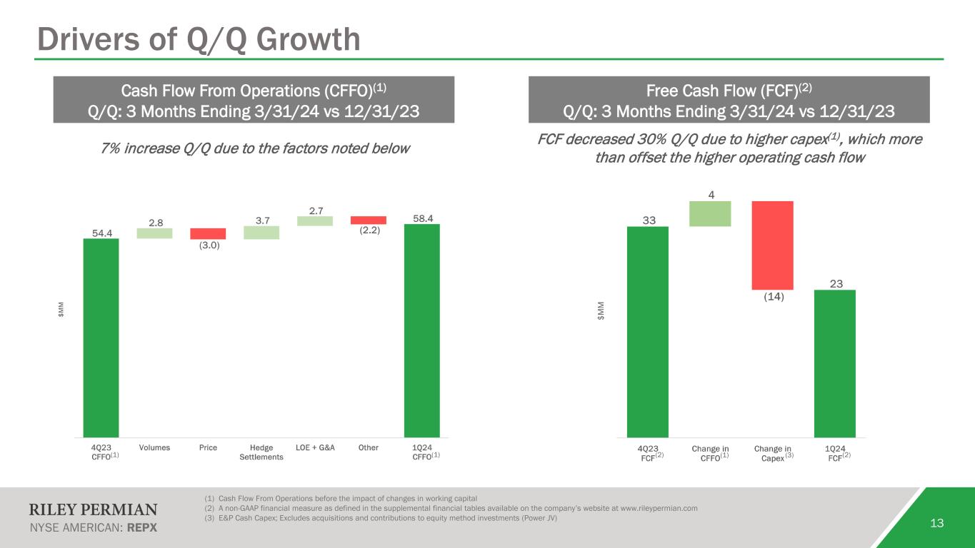 Highlights from 1Q24 Earnings Release 12 1 Production 2 Cash Flow 3 Reinvestment 4 FCF Conversion Increased oil production by 4% Q/Q to 14.2MBbls/d with total production of 20.4MBoe/d Generated $58MM of CFFO and $70MM of Adjusted EBITDAX (70% margin) Reinvested 45% of CFFO into capital expenditures on an accrual basis and 60% on a cash basis Converted 40% of CFFO to FCF for $23MM in 1Q24 (based on cash capital expenditures) 5 FCF Yield 6 Shareholder Return 7 Debt Reduction 8 Acquisition Generated $91MM of LTM FCF for 15% yield on equity market capitalization Allocated 31% of FCF to direct shareholder return through dividends (5.2% annualized yield) Reduced debt by $15MM (1.3x principal value of debt to LTM Adj. EBITDAX) Closed asset acquisition in New Mexico in 2Q24 which adds development inventory Note: The non-GAAP financial measures include Adjusted EBITDAX, and Free Cash Flow (FCF), which can be further defined in the supplemental financial tables available on the company’s website at www.rileypermian.com. Cash Flow from Operations (CFFO) is shown before the changes of working capital. Accrual based capex and cash based capex exclude the impact of acquisitions. Last Twelve Months (LTM) represents a sum of 2Q23 through 1Q24 for select metrics. Market capitalization for FCF Yield and Dividend Yield are based on share price as of 6/20/24 and shares outstanding as of 5/31/24. Future dividends subject to approval by the Board of Directors