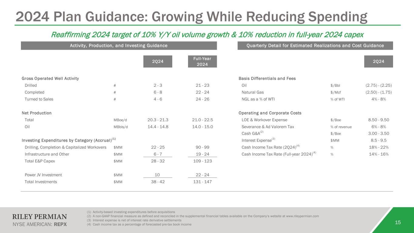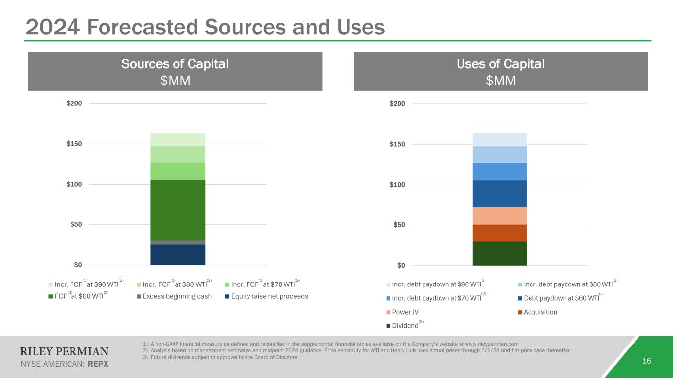 15 2024 Plan Guidance: Growing While Reducing Spending (1) Activity-based investing expenditures before acquisitions (2) A non-GAAP financial measure as defined and reconciled in the supplemental financial tables available on the Company’s website at www.rileypermian.com (3) Interest expense is net of interest rate derivative settlements (4) Cash income tax as a percentage of forecasted pre-tax book income Reaffirming 2024 target of 10% Y/Y oil volume growth & 10% reduction in full-year 2024 capex Activity, Production, and Investing Guidance Quarterly Detail for Estimated Realizations and Cost Guidance Gross Operated Well Activity Basis Differentials and Fees Drilled # 2 - 3 21 - 23 Oil $/Bbl (2.75) - (2.25) Completed # 6 - 8 22 - 24 Natural Gas $/Mcf (2.50) - (1.75) Turned to Sales # 4 - 6 24 - 26 NGL as a % of WTI % of WTI 4% - 8% Net Production Operating and Corporate Costs Total MBoe/d 20.3 - 21.3 21.0 - 22.5 LOE & Workover Expense $/Boe 8.50 - 9.50 Oil MBbls/d 14.4 - 14.8 14.0 - 15.0 Severance & Ad Valorem Tax % of revenue 6% - 8% Cash G&A(2) $/Boe 3.00 - 3.50 Investing Expenditures by Category (Accrual)(1) Interest Expense(3) $MM 8.5 - 9.5 Drilling, Completion & Capitalized Workovers $MM 22 - 25 90 - 99 Cash Income Tax Rate (2Q24)(4) % 18% - 22% Infrastructure and Other $MM 6 - 7 19 - 24 Cash Income Tax Rate (Full-year 2024)(4) % 14% - 16% Total E&P Capex $MM 28 - 32 109 - 123 Power JV Investment $MM 10 22 - 24 Total Investments $MM 38 - 42 131 - 147 2Q24 Full-Year 2024 2Q24