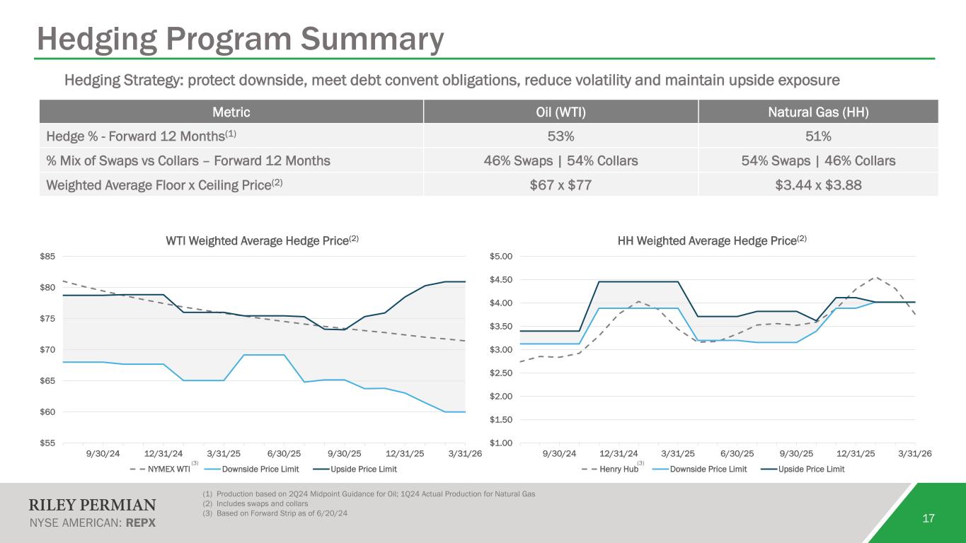 $0 $50 $100 $150 $200 Incr. FCF at $90 WTI Incr. FCF at $80 WTI Incr. FCF at $70 WTI FCF at $60 WTI Excess beginning cash Equity raise net proceeds Sources of Capital $MM Uses of Capital $MM 16 2024 Forecasted Sources and Uses (1) A non-GAAP financial measure as defined and reconciled in the supplemental financial tables available on the Company’s website at www.rileypermian.com (2) Analysis based on management estimates and midpoint 2024 guidance. Price sensitivity for WTI and Henry Hub uses actual prices through 5/2/24 and flat price case thereafter (3) Future dividends subject to approval by the Board of Directors $0 $50 $100 $150 $200 Incr. debt paydown at $90 WTI Incr. debt paydown at $80 WTI Incr. debt paydown at $70 WTI Debt paydown at $60 WTI Power JV Acquisition Dividend (2) (2) (2) (2) (3) (1) (1)(1) (1) (2) (2)(2) (2)