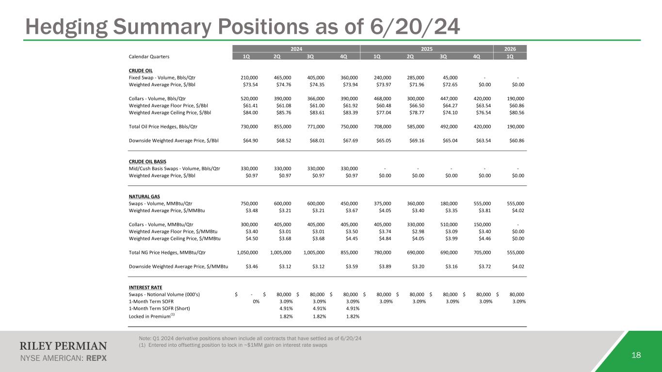 $1.00 $1.50 $2.00 $2.50 $3.00 $3.50 $4.00 $4.50 $5.00 9/30/24 12/31/24 3/31/25 6/30/25 9/30/25 12/31/25 3/31/26 HH Weighted Average Hedge Price(2) Henry Hub Downside Price Limit Upside Price Limit 17 Hedging Program Summary Hedging Strategy: protect downside, meet debt convent obligations, reduce volatility and maintain upside exposure Metric Oil (WTI) Natural Gas (HH) Hedge % - Forward 12 Months(1) 53% 51% % Mix of Swaps vs Collars – Forward 12 Months 46% Swaps | 54% Collars 54% Swaps | 46% Collars Weighted Average Floor x Ceiling Price(2) $67 x $77 $3.44 x $3.88 (1) Production based on 2Q24 Midpoint Guidance for Oil; 1Q24 Actual Production for Natural Gas (2) Includes swaps and collars (3) Based on Forward Strip as of 6/20/24 $55 $60 $65 $70 $75 $80 $85 9/30/24 12/31/24 3/31/25 6/30/25 9/30/25 12/31/25 3/31/26 WTI Weighted Average Hedge Price(2) NYMEX WTI Downside Price Limit Upside Price Limit (3) (3)
