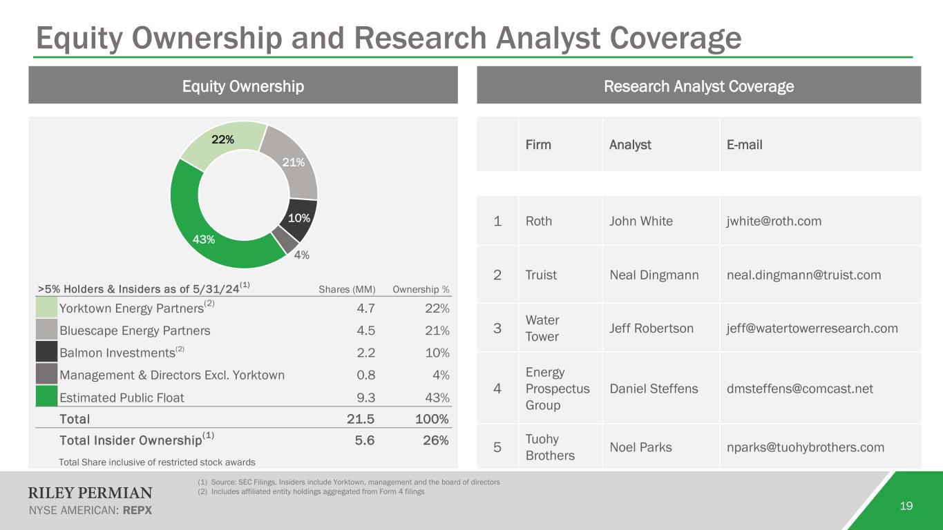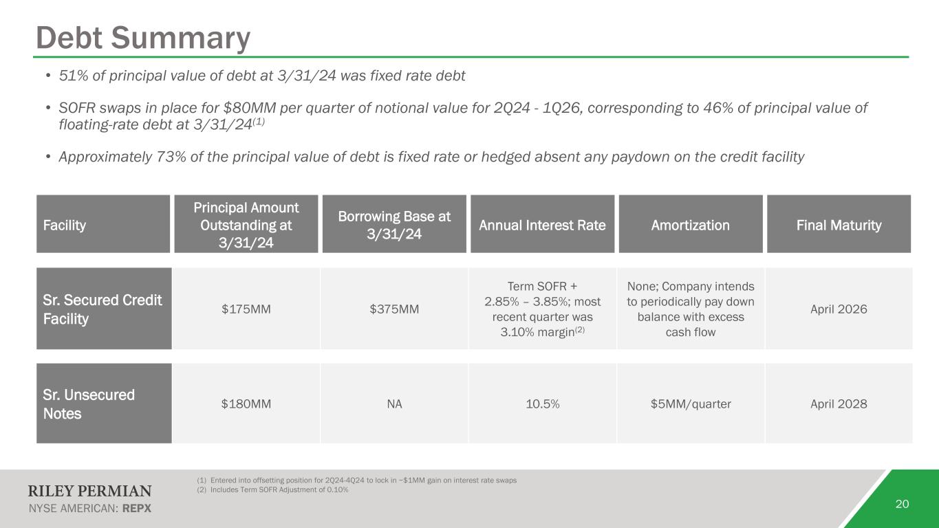 18 Hedging Summary Positions as of 6/20/24 Note: Q1 2024 derivative positions shown include all contracts that have settled as of 6/20/24 (1) Entered into offsetting position to lock in ~$1MM gain on interest rate swaps 2024 2025 2026 Calendar Quarters 1Q 2Q 3Q 4Q 1Q 2Q 3Q 4Q 1Q CRUDE OIL Fixed Swap - Volume, Bbls/Qtr 210,000 465,000 405,000 360,000 240,000 285,000 45,000 - - Weighted Average Price, $/Bbl $73.54 $74.76 $74.35 $73.94 $73.97 $71.96 $72.65 $0.00 $0.00 Collars - Volume, Bbls/Qtr 520,000 390,000 366,000 390,000 468,000 300,000 447,000 420,000 190,000 Weighted Average Floor Price, $/Bbl $61.41 $61.08 $61.00 $61.92 $60.48 $66.50 $64.27 $63.54 $60.86 Weighted Average Ceiling Price, $/Bbl $84.00 $85.76 $83.61 $83.39 $77.04 $78.77 $74.10 $76.54 $80.56 Total Oil Price Hedges, Bbls/Qtr 730,000 855,000 771,000 750,000 708,000 585,000 492,000 420,000 190,000 Downside Weighted Average Price, $/Bbl $64.90 $68.52 $68.01 $67.69 $65.05 $69.16 $65.04 $63.54 $60.86 CRUDE OIL BASIS Mid/Cush Basis Swaps - Volume, Bbls/Qtr 330,000 330,000 330,000 330,000 - - - - - Weighted Average Price, $/Bbl $0.97 $0.97 $0.97 $0.97 $0.00 $0.00 $0.00 $0.00 $0.00 NATURAL GAS Swaps - Volume, MMBtu/Qtr 750,000 600,000 600,000 450,000 375,000 360,000 180,000 555,000 555,000 Weighted Average Price, $/MMBtu $3.48 $3.21 $3.21 $3.67 $4.05 $3.40 $3.35 $3.81 $4.02 Collars - Volume, MMBtu/Qtr 300,000 405,000 405,000 405,000 405,000 330,000 510,000 150,000 - Weighted Average Floor Price, $/MMBtu $3.40 $3.01 $3.01 $3.50 $3.74 $2.98 $3.09 $3.40 $0.00 Weighted Average Ceiling Price, $/MMBtu $4.50 $3.68 $3.68 $4.45 $4.84 $4.05 $3.99 $4.46 $0.00 Total NG Price Hedges, MMBtu/Qtr 1,050,000 1,005,000 1,005,000 855,000 780,000 690,000 690,000 705,000 555,000 Downside Weighted Average Price, $/MMBtu $3.46 $3.12 $3.12 $3.59 $3.89 $3.20 $3.16 $3.72 $4.02 INTEREST RATE Swaps - Notional Volume (000's) -$ 80,000$ 80,000$ 80,000$ 80,000$ 80,000$ 80,000$ 80,000$ 80,000$ 1-Month Term SOFR 0% 3.09% 3.09% 3.09% 3.09% 3.09% 3.09% 3.09% 3.09% 1-Month Term SOFR (Short) 4.91% 4.91% 4.91% Locked in Premium(1) 1.82% 1.82% 1.82%