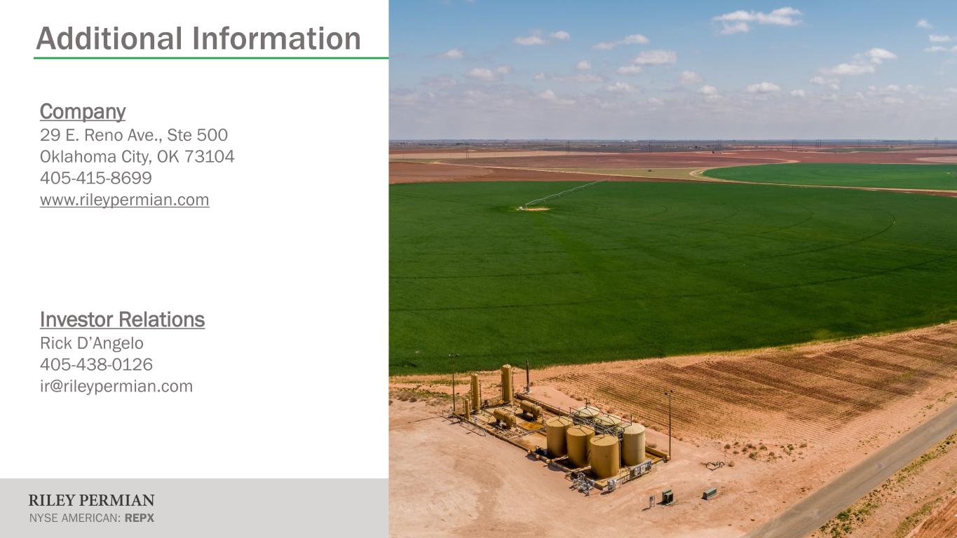 Additional Information 21 Company 29 E. Reno Ave., Ste 500 Oklahoma City, OK 73104 405-415-8699 www.rileypermian.com Investor Relations Rick D’Angelo 405-438-0126 ir@rileypermian.com