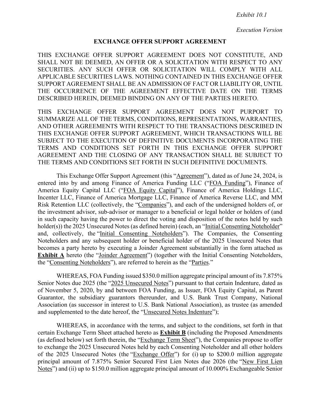 Exhibit 10.1 Execution Version EXCHANGE OFFER SUPPORT AGREEMENT THIS EXCHANGE OFFER SUPPORT AGREEMENT DOES NOT CONSTITUTE, AND SHALL NOT BE DEEMED, AN OFFER OR A SOLICITATION WITH RESPECT TO ANY SECURITIES. ANY SUCH OFFER OR SOLICITATION WILL COMPLY WITH ALL APPLICABLE SECURITIES LAWS. NOTHING CONTAINED IN THIS EXCHANGE OFFER SUPPORT AGREEMENT SHALL BE AN ADMISSION OF FACT OR LIABILITY OR, UNTIL THE OCCURRENCE OF THE AGREEMENT EFFECTIVE DATE ON THE TERMS DESCRIBED HEREIN, DEEMED BINDING ON ANY OF THE PARTIES HERETO. THIS EXCHANGE OFFER SUPPORT AGREEMENT DOES NOT PURPORT TO SUMMARIZE ALL OF THE TERMS, CONDITIONS, REPRESENTATIONS, WARRANTIES, AND OTHER AGREEMENTS WITH RESPECT TO THE TRANSACTIONS DESCRIBED IN THIS EXCHANGE OFFER SUPPORT AGREEMENT, WHICH TRANSACTIONS WILL BE SUBJECT TO THE EXECUTION OF DEFINITIVE DOCUMENTS INCORPORATING THE TERMS AND CONDITIONS SET FORTH IN THIS EXCHANGE OFFER SUPPORT AGREEMENT AND THE CLOSING OF ANY TRANSACTION SHALL BE SUBJECT TO THE TERMS AND CONDITIONS SET FORTH IN SUCH DEFINITIVE DOCUMENTS. This Exchange Offer Support Agreement (this “Agreement”), dated as of June 24, 2024, is entered into by and among Finance of America Funding LLC (“FOA Funding”), Finance of America Equity Capital LLC (“FOA Equity Capital”), Finance of America Holdings LLC, Incenter LLC, Finance of America Mortgage LLC, Finance of America Reverse LLC, and MM Risk Retention LLC (collectively, the “Companies”), and each of the undersigned holders of, or the investment advisor, sub-advisor or manager to a beneficial or legal holder or holders of (and in such capacity having the power to direct the voting and disposition of the notes held by such holder(s)) the 2025 Unsecured Notes (as defined herein) (each, an “Initial Consenting Noteholder” and, collectively, the “Initial Consenting Noteholders”). The Companies, the Consenting Noteholders and any subsequent holder or beneficial holder of the 2025 Unsecured Notes that becomes a party hereto by executing a Joinder Agreement substantially in the form attached as Exhibit A hereto (the “Joinder Agreement”) (together with the Initial Consenting Noteholders, the “Consenting Noteholders”), are referred to herein as the “Parties.” WHEREAS, FOA Funding issued $350.0 million aggregate principal amount of its 7.875% Senior Notes due 2025 (the “2025 Unsecured Notes”) pursuant to that certain Indenture, dated as of November 5, 2020, by and between FOA Funding, as Issuer, FOA Equity Capital, as Parent Guarantor, the subsidiary guarantors thereunder, and U.S. Bank Trust Company, National Association (as successor in interest to U.S. Bank National Association), as trustee (as amended and supplemented to the date hereof, the “Unsecured Notes Indenture”); WHEREAS, in accordance with the terms, and subject to the conditions, set forth in that certain Exchange Term Sheet attached hereto as Exhibit B (including the Proposed Amendments (as defined below) set forth therein, the “Exchange Term Sheet”), the Companies propose to offer to exchange the 2025 Unsecured Notes held by each Consenting Noteholder and all other holders of the 2025 Unsecured Notes (the “Exchange Offer”) for (i) up to $200.0 million aggregate principal amount of 7.875% Senior Secured First Lien Notes due 2026 (the “New First Lien Notes”) and (ii) up to $150.0 million aggregate principal amount of 10.000% Exchangeable Senior