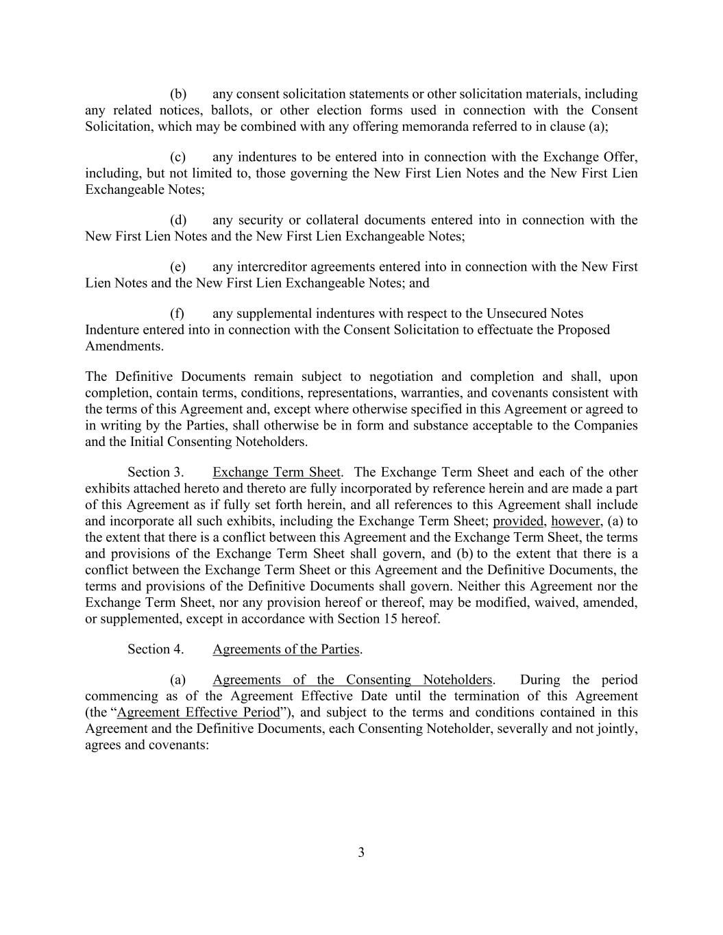 3 (b) any consent solicitation statements or other solicitation materials, including any related notices, ballots, or other election forms used in connection with the Consent Solicitation, which may be combined with any offering memoranda referred to in clause (a); (c) any indentures to be entered into in connection with the Exchange Offer, including, but not limited to, those governing the New First Lien Notes and the New First Lien Exchangeable Notes; (d) any security or collateral documents entered into in connection with the New First Lien Notes and the New First Lien Exchangeable Notes; (e) any intercreditor agreements entered into in connection with the New First Lien Notes and the New First Lien Exchangeable Notes; and (f) any supplemental indentures with respect to the Unsecured Notes Indenture entered into in connection with the Consent Solicitation to effectuate the Proposed Amendments. The Definitive Documents remain subject to negotiation and completion and shall, upon completion, contain terms, conditions, representations, warranties, and covenants consistent with the terms of this Agreement and, except where otherwise specified in this Agreement or agreed to in writing by the Parties, shall otherwise be in form and substance acceptable to the Companies and the Initial Consenting Noteholders. Section 3. Exchange Term Sheet. The Exchange Term Sheet and each of the other exhibits attached hereto and thereto are fully incorporated by reference herein and are made a part of this Agreement as if fully set forth herein, and all references to this Agreement shall include and incorporate all such exhibits, including the Exchange Term Sheet; provided, however, (a) to the extent that there is a conflict between this Agreement and the Exchange Term Sheet, the terms and provisions of the Exchange Term Sheet shall govern, and (b) to the extent that there is a conflict between the Exchange Term Sheet or this Agreement and the Definitive Documents, the terms and provisions of the Definitive Documents shall govern. Neither this Agreement nor the Exchange Term Sheet, nor any provision hereof or thereof, may be modified, waived, amended, or supplemented, except in accordance with Section 15 hereof. Section 4. Agreements of the Parties. (a) Agreements of the Consenting Noteholders. During the period commencing as of the Agreement Effective Date until the termination of this Agreement (the “Agreement Effective Period”), and subject to the terms and conditions contained in this Agreement and the Definitive Documents, each Consenting Noteholder, severally and not jointly, agrees and covenants:
