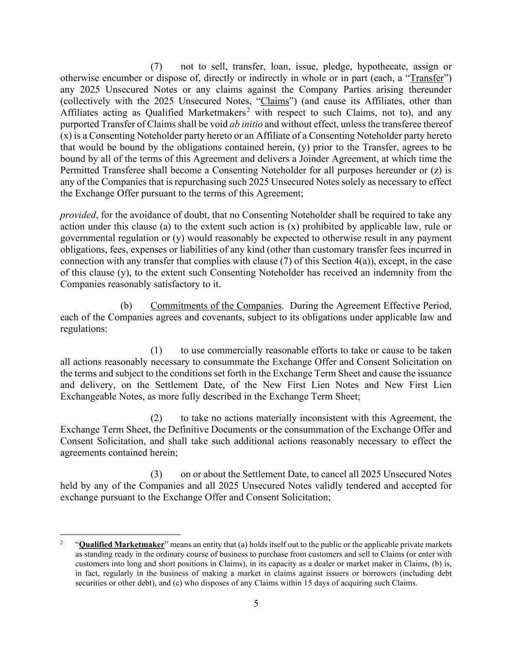 5 (7) not to sell, transfer, loan, issue, pledge, hypothecate, assign or otherwise encumber or dispose of, directly or indirectly in whole or in part (each, a “Transfer”) any 2025 Unsecured Notes or any claims against the Company Parties arising thereunder (collectively with the 2025 Unsecured Notes, “Claims”) (and cause its Affiliates, other than Affiliates acting as Qualified Marketmakers2 with respect to such Claims, not to), and any purported Transfer of Claims shall be void ab initio and without effect, unless the transferee thereof (x) is a Consenting Noteholder party hereto or an Affiliate of a Consenting Noteholder party hereto that would be bound by the obligations contained herein, (y) prior to the Transfer, agrees to be bound by all of the terms of this Agreement and delivers a Joinder Agreement, at which time the Permitted Transferee shall become a Consenting Noteholder for all purposes hereunder or (z) is any of the Companies that is repurchasing such 2025 Unsecured Notes solely as necessary to effect the Exchange Offer pursuant to the terms of this Agreement; provided, for the avoidance of doubt, that no Consenting Noteholder shall be required to take any action under this clause (a) to the extent such action is (x) prohibited by applicable law, rule or governmental regulation or (y) would reasonably be expected to otherwise result in any payment obligations, fees, expenses or liabilities of any kind (other than customary transfer fees incurred in connection with any transfer that complies with clause (7) of this Section 4(a)), except, in the case of this clause (y), to the extent such Consenting Noteholder has received an indemnity from the Companies reasonably satisfactory to it. (b) Commitments of the Companies. During the Agreement Effective Period, each of the Companies agrees and covenants, subject to its obligations under applicable law and regulations: (1) to use commercially reasonable efforts to take or cause to be taken all actions reasonably necessary to consummate the Exchange Offer and Consent Solicitation on the terms and subject to the conditions set forth in the Exchange Term Sheet and cause the issuance and delivery, on the Settlement Date, of the New First Lien Notes and New First Lien Exchangeable Notes, as more fully described in the Exchange Term Sheet; (2) to take no actions materially inconsistent with this Agreement, the Exchange Term Sheet, the Definitive Documents or the consummation of the Exchange Offer and Consent Solicitation, and shall take such additional actions reasonably necessary to effect the agreements contained herein; (3) on or about the Settlement Date, to cancel all 2025 Unsecured Notes held by any of the Companies and all 2025 Unsecured Notes validly tendered and accepted for exchange pursuant to the Exchange Offer and Consent Solicitation; 2 “Qualified Marketmaker” means an entity that (a) holds itself out to the public or the applicable private markets as standing ready in the ordinary course of business to purchase from customers and sell to Claims (or enter with customers into long and short positions in Claims), in its capacity as a dealer or market maker in Claims, (b) is, in fact, regularly in the business of making a market in claims against issuers or borrowers (including debt securities or other debt), and (c) who disposes of any Claims within 15 days of acquiring such Claims.