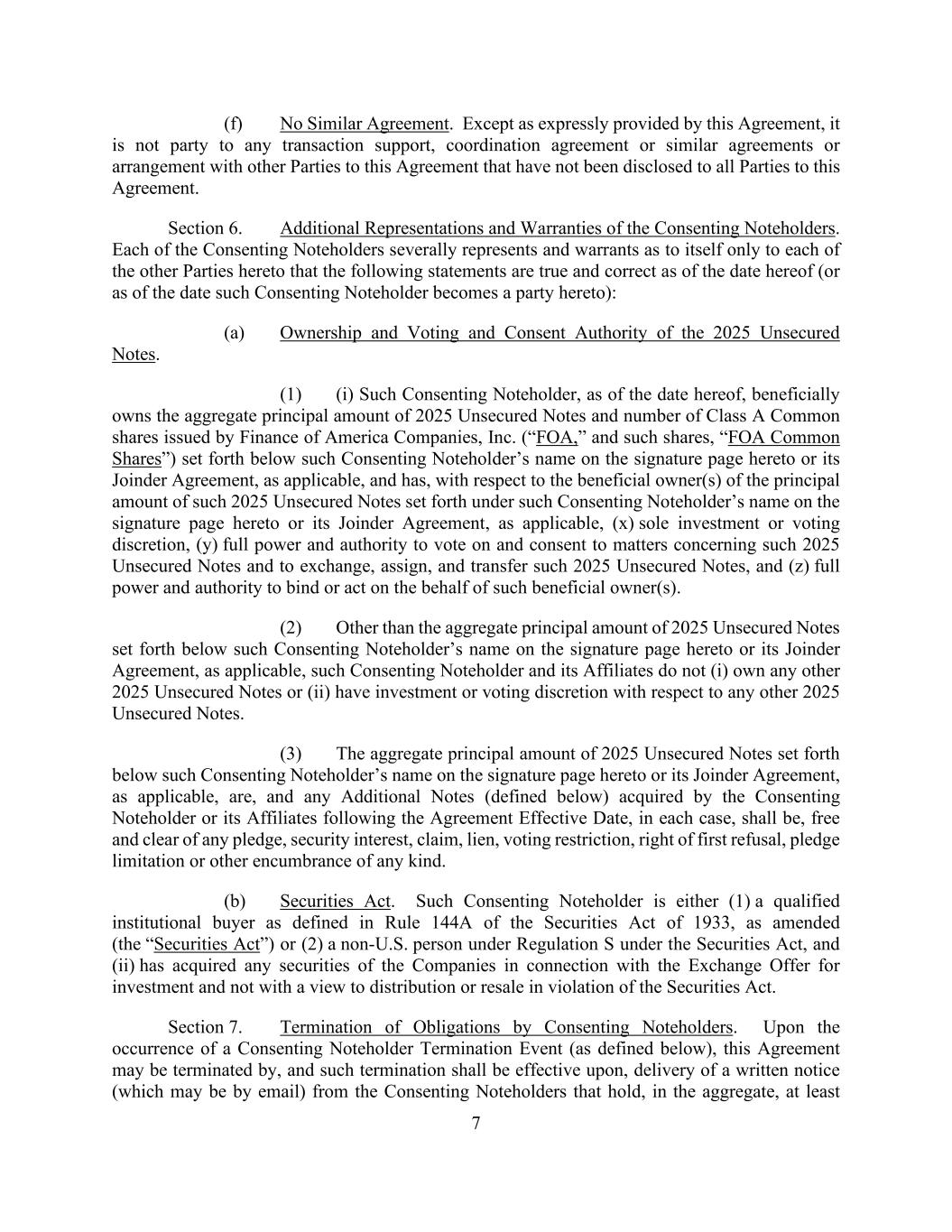 7 (f) No Similar Agreement. Except as expressly provided by this Agreement, it is not party to any transaction support, coordination agreement or similar agreements or arrangement with other Parties to this Agreement that have not been disclosed to all Parties to this Agreement. Section 6. Additional Representations and Warranties of the Consenting Noteholders. Each of the Consenting Noteholders severally represents and warrants as to itself only to each of the other Parties hereto that the following statements are true and correct as of the date hereof (or as of the date such Consenting Noteholder becomes a party hereto): (a) Ownership and Voting and Consent Authority of the 2025 Unsecured Notes. (1) (i) Such Consenting Noteholder, as of the date hereof, beneficially owns the aggregate principal amount of 2025 Unsecured Notes and number of Class A Common shares issued by Finance of America Companies, Inc. (“FOA,” and such shares, “FOA Common Shares”) set forth below such Consenting Noteholder’s name on the signature page hereto or its Joinder Agreement, as applicable, and has, with respect to the beneficial owner(s) of the principal amount of such 2025 Unsecured Notes set forth under such Consenting Noteholder’s name on the signature page hereto or its Joinder Agreement, as applicable, (x) sole investment or voting discretion, (y) full power and authority to vote on and consent to matters concerning such 2025 Unsecured Notes and to exchange, assign, and transfer such 2025 Unsecured Notes, and (z) full power and authority to bind or act on the behalf of such beneficial owner(s). (2) Other than the aggregate principal amount of 2025 Unsecured Notes set forth below such Consenting Noteholder’s name on the signature page hereto or its Joinder Agreement, as applicable, such Consenting Noteholder and its Affiliates do not (i) own any other 2025 Unsecured Notes or (ii) have investment or voting discretion with respect to any other 2025 Unsecured Notes. (3) The aggregate principal amount of 2025 Unsecured Notes set forth below such Consenting Noteholder’s name on the signature page hereto or its Joinder Agreement, as applicable, are, and any Additional Notes (defined below) acquired by the Consenting Noteholder or its Affiliates following the Agreement Effective Date, in each case, shall be, free and clear of any pledge, security interest, claim, lien, voting restriction, right of first refusal, pledge limitation or other encumbrance of any kind. (b) Securities Act. Such Consenting Noteholder is either (1) a qualified institutional buyer as defined in Rule 144A of the Securities Act of 1933, as amended (the “Securities Act”) or (2) a non-U.S. person under Regulation S under the Securities Act, and (ii) has acquired any securities of the Companies in connection with the Exchange Offer for investment and not with a view to distribution or resale in violation of the Securities Act. Section 7. Termination of Obligations by Consenting Noteholders. Upon the occurrence of a Consenting Noteholder Termination Event (as defined below), this Agreement may be terminated by, and such termination shall be effective upon, delivery of a written notice (which may be by email) from the Consenting Noteholders that hold, in the aggregate, at least