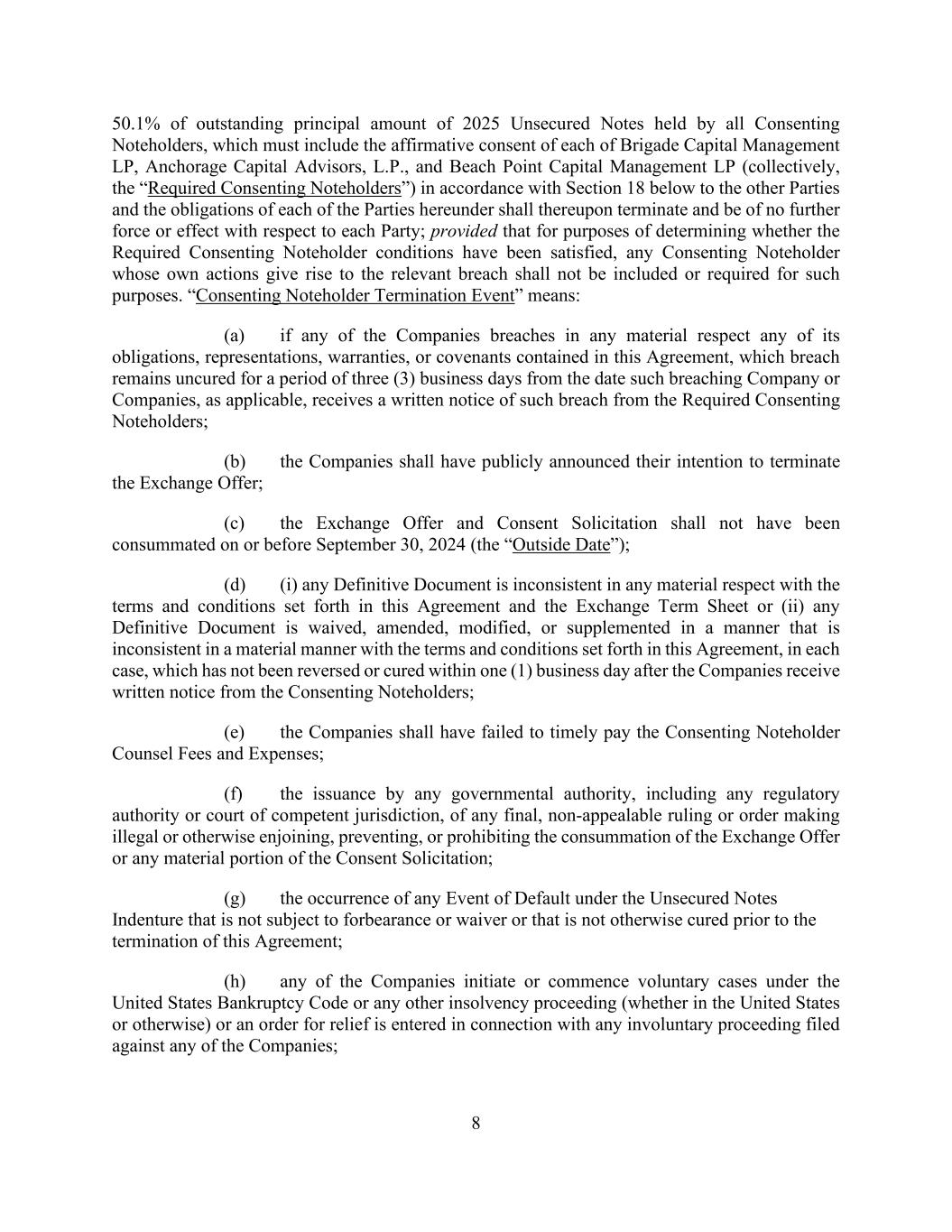 8 50.1% of outstanding principal amount of 2025 Unsecured Notes held by all Consenting Noteholders, which must include the affirmative consent of each of Brigade Capital Management LP, Anchorage Capital Advisors, L.P., and Beach Point Capital Management LP (collectively, the “Required Consenting Noteholders”) in accordance with Section 18 below to the other Parties and the obligations of each of the Parties hereunder shall thereupon terminate and be of no further force or effect with respect to each Party; provided that for purposes of determining whether the Required Consenting Noteholder conditions have been satisfied, any Consenting Noteholder whose own actions give rise to the relevant breach shall not be included or required for such purposes. “Consenting Noteholder Termination Event” means: (a) if any of the Companies breaches in any material respect any of its obligations, representations, warranties, or covenants contained in this Agreement, which breach remains uncured for a period of three (3) business days from the date such breaching Company or Companies, as applicable, receives a written notice of such breach from the Required Consenting Noteholders; (b) the Companies shall have publicly announced their intention to terminate the Exchange Offer; (c) the Exchange Offer and Consent Solicitation shall not have been consummated on or before September 30, 2024 (the “Outside Date”); (d) (i) any Definitive Document is inconsistent in any material respect with the terms and conditions set forth in this Agreement and the Exchange Term Sheet or (ii) any Definitive Document is waived, amended, modified, or supplemented in a manner that is inconsistent in a material manner with the terms and conditions set forth in this Agreement, in each case, which has not been reversed or cured within one (1) business day after the Companies receive written notice from the Consenting Noteholders; (e) the Companies shall have failed to timely pay the Consenting Noteholder Counsel Fees and Expenses; (f) the issuance by any governmental authority, including any regulatory authority or court of competent jurisdiction, of any final, non-appealable ruling or order making illegal or otherwise enjoining, preventing, or prohibiting the consummation of the Exchange Offer or any material portion of the Consent Solicitation; (g) the occurrence of any Event of Default under the Unsecured Notes Indenture that is not subject to forbearance or waiver or that is not otherwise cured prior to the termination of this Agreement; (h) any of the Companies initiate or commence voluntary cases under the United States Bankruptcy Code or any other insolvency proceeding (whether in the United States or otherwise) or an order for relief is entered in connection with any involuntary proceeding filed against any of the Companies;