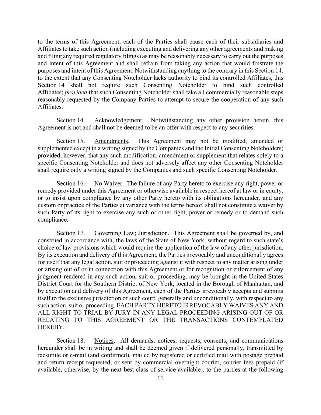 11 to the terms of this Agreement, each of the Parties shall cause each of their subsidiaries and Affiliates to take such action (including executing and delivering any other agreements and making and filing any required regulatory filings) as may be reasonably necessary to carry out the purposes and intent of this Agreement and shall refrain from taking any action that would frustrate the purposes and intent of this Agreement. Notwithstanding anything to the contrary in this Section 14, to the extent that any Consenting Noteholder lacks authority to bind its controlled Affiliates, this Section 14 shall not require such Consenting Noteholder to bind such controlled Affiliates; provided that such Consenting Noteholder shall take all commercially reasonable steps reasonably requested by the Company Parties to attempt to secure the cooperation of any such Affiliates. Section 14. Acknowledgement. Notwithstanding any other provision herein, this Agreement is not and shall not be deemed to be an offer with respect to any securities. Section 15. Amendments. This Agreement may not be modified, amended or supplemented except in a writing signed by the Companies and the Initial Consenting Noteholders; provided, however, that any such modification, amendment or supplement that relates solely to a specific Consenting Noteholder and does not adversely affect any other Consenting Noteholder shall require only a writing signed by the Companies and such specific Consenting Noteholder. Section 16. No Waiver. The failure of any Party hereto to exercise any right, power or remedy provided under this Agreement or otherwise available in respect hereof at law or in equity, or to insist upon compliance by any other Party hereto with its obligations hereunder, and any custom or practice of the Parties at variance with the terms hereof, shall not constitute a waiver by such Party of its right to exercise any such or other right, power or remedy or to demand such compliance. Section 17. Governing Law; Jurisdiction. This Agreement shall be governed by, and construed in accordance with, the laws of the State of New York, without regard to such state’s choice of law provisions which would require the application of the law of any other jurisdiction. By its execution and delivery of this Agreement, the Parties irrevocably and unconditionally agrees for itself that any legal action, suit or proceeding against it with respect to any matter arising under or arising out of or in connection with this Agreement or for recognition or enforcement of any judgment rendered in any such action, suit or proceeding, may be brought in the United States District Court for the Southern District of New York, located in the Borough of Manhattan, and by execution and delivery of this Agreement, each of the Parties irrevocably accepts and submits itself to the exclusive jurisdiction of such court, generally and unconditionally, with respect to any such action, suit or proceeding. EACH PARTY HERETO IRREVOCABLY WAIVES ANY AND ALL RIGHT TO TRIAL BY JURY IN ANY LEGAL PROCEEDING ARISING OUT OF OR RELATING TO THIS AGREEMENT OR THE TRANSACTIONS CONTEMPLATED HEREBY. Section 18. Notices. All demands, notices, requests, consents, and communications hereunder shall be in writing and shall be deemed given if delivered personally, transmitted by facsimile or e-mail (and confirmed), mailed by registered or certified mail with postage prepaid and return receipt requested, or sent by commercial overnight courier, courier fees prepaid (if available; otherwise, by the next best class of service available), to the parties at the following