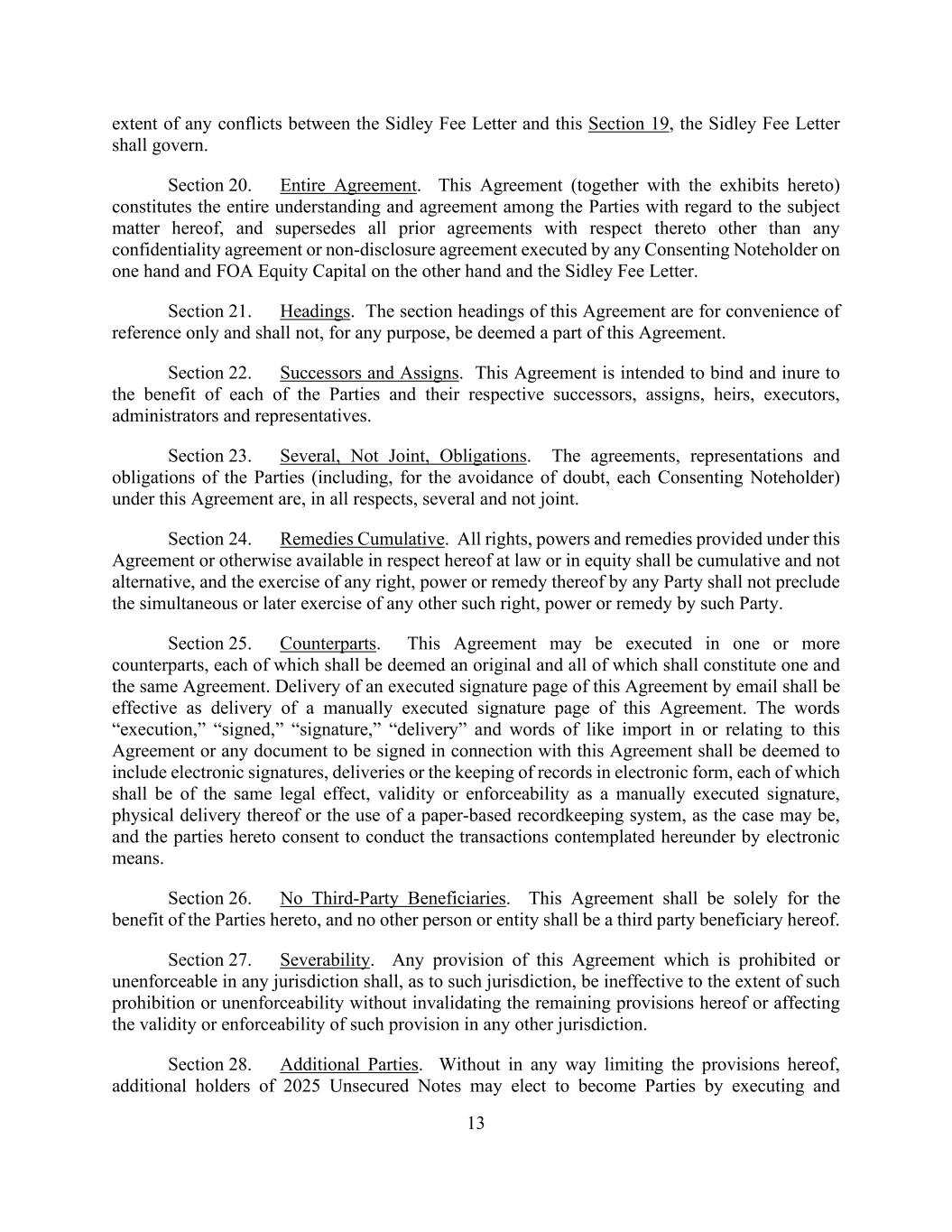 13 extent of any conflicts between the Sidley Fee Letter and this Section 19, the Sidley Fee Letter shall govern. Section 20. Entire Agreement. This Agreement (together with the exhibits hereto) constitutes the entire understanding and agreement among the Parties with regard to the subject matter hereof, and supersedes all prior agreements with respect thereto other than any confidentiality agreement or non-disclosure agreement executed by any Consenting Noteholder on one hand and FOA Equity Capital on the other hand and the Sidley Fee Letter. Section 21. Headings. The section headings of this Agreement are for convenience of reference only and shall not, for any purpose, be deemed a part of this Agreement. Section 22. Successors and Assigns. This Agreement is intended to bind and inure to the benefit of each of the Parties and their respective successors, assigns, heirs, executors, administrators and representatives. Section 23. Several, Not Joint, Obligations. The agreements, representations and obligations of the Parties (including, for the avoidance of doubt, each Consenting Noteholder) under this Agreement are, in all respects, several and not joint. Section 24. Remedies Cumulative. All rights, powers and remedies provided under this Agreement or otherwise available in respect hereof at law or in equity shall be cumulative and not alternative, and the exercise of any right, power or remedy thereof by any Party shall not preclude the simultaneous or later exercise of any other such right, power or remedy by such Party. Section 25. Counterparts. This Agreement may be executed in one or more counterparts, each of which shall be deemed an original and all of which shall constitute one and the same Agreement. Delivery of an executed signature page of this Agreement by email shall be effective as delivery of a manually executed signature page of this Agreement. The words “execution,” “signed,” “signature,” “delivery” and words of like import in or relating to this Agreement or any document to be signed in connection with this Agreement shall be deemed to include electronic signatures, deliveries or the keeping of records in electronic form, each of which shall be of the same legal effect, validity or enforceability as a manually executed signature, physical delivery thereof or the use of a paper-based recordkeeping system, as the case may be, and the parties hereto consent to conduct the transactions contemplated hereunder by electronic means. Section 26. No Third-Party Beneficiaries. This Agreement shall be solely for the benefit of the Parties hereto, and no other person or entity shall be a third party beneficiary hereof. Section 27. Severability. Any provision of this Agreement which is prohibited or unenforceable in any jurisdiction shall, as to such jurisdiction, be ineffective to the extent of such prohibition or unenforceability without invalidating the remaining provisions hereof or affecting the validity or enforceability of such provision in any other jurisdiction. Section 28. Additional Parties. Without in any way limiting the provisions hereof, additional holders of 2025 Unsecured Notes may elect to become Parties by executing and