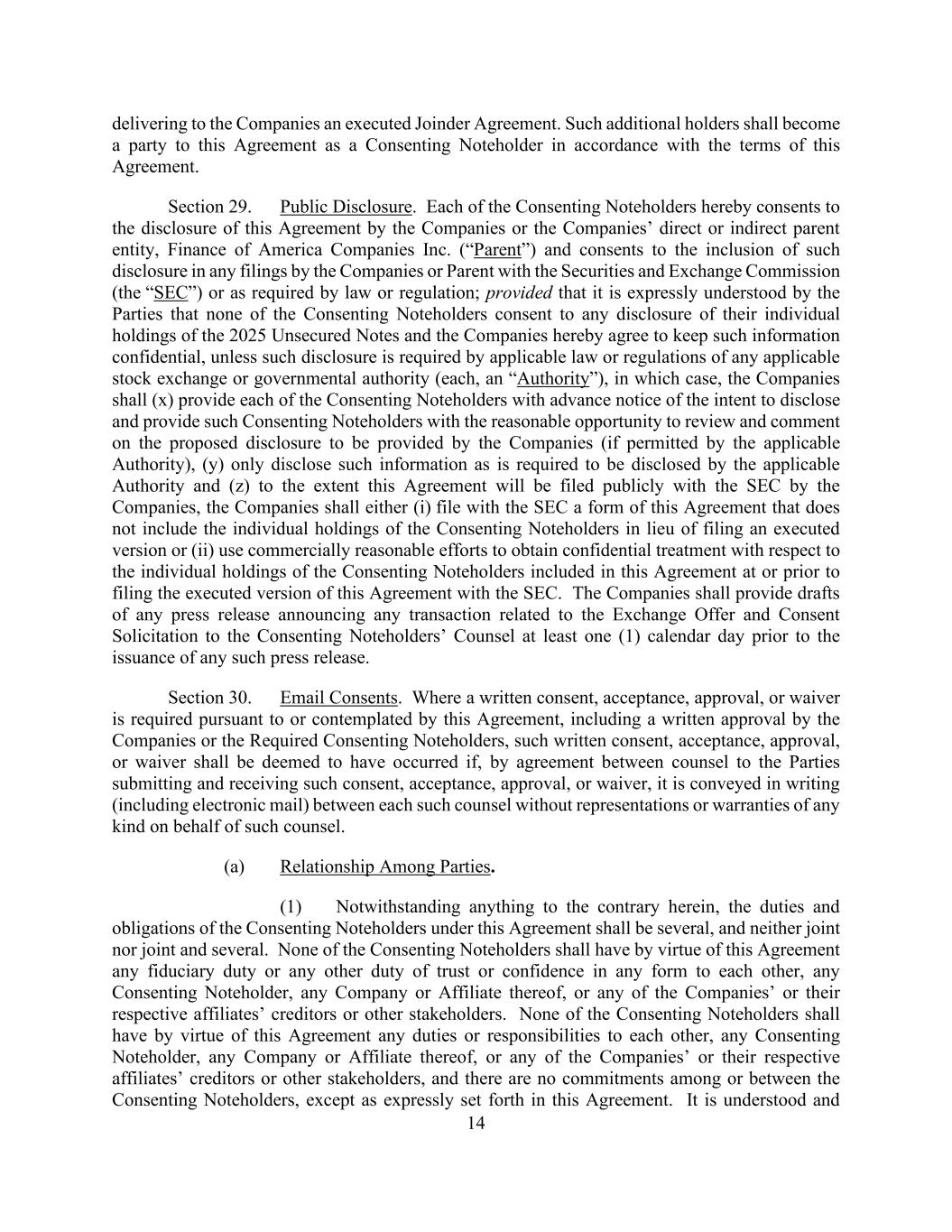 14 delivering to the Companies an executed Joinder Agreement. Such additional holders shall become a party to this Agreement as a Consenting Noteholder in accordance with the terms of this Agreement. Section 29. Public Disclosure. Each of the Consenting Noteholders hereby consents to the disclosure of this Agreement by the Companies or the Companies’ direct or indirect parent entity, Finance of America Companies Inc. (“Parent”) and consents to the inclusion of such disclosure in any filings by the Companies or Parent with the Securities and Exchange Commission (the “SEC”) or as required by law or regulation; provided that it is expressly understood by the Parties that none of the Consenting Noteholders consent to any disclosure of their individual holdings of the 2025 Unsecured Notes and the Companies hereby agree to keep such information confidential, unless such disclosure is required by applicable law or regulations of any applicable stock exchange or governmental authority (each, an “Authority”), in which case, the Companies shall (x) provide each of the Consenting Noteholders with advance notice of the intent to disclose and provide such Consenting Noteholders with the reasonable opportunity to review and comment on the proposed disclosure to be provided by the Companies (if permitted by the applicable Authority), (y) only disclose such information as is required to be disclosed by the applicable Authority and (z) to the extent this Agreement will be filed publicly with the SEC by the Companies, the Companies shall either (i) file with the SEC a form of this Agreement that does not include the individual holdings of the Consenting Noteholders in lieu of filing an executed version or (ii) use commercially reasonable efforts to obtain confidential treatment with respect to the individual holdings of the Consenting Noteholders included in this Agreement at or prior to filing the executed version of this Agreement with the SEC. The Companies shall provide drafts of any press release announcing any transaction related to the Exchange Offer and Consent Solicitation to the Consenting Noteholders’ Counsel at least one (1) calendar day prior to the issuance of any such press release. Section 30. Email Consents. Where a written consent, acceptance, approval, or waiver is required pursuant to or contemplated by this Agreement, including a written approval by the Companies or the Required Consenting Noteholders, such written consent, acceptance, approval, or waiver shall be deemed to have occurred if, by agreement between counsel to the Parties submitting and receiving such consent, acceptance, approval, or waiver, it is conveyed in writing (including electronic mail) between each such counsel without representations or warranties of any kind on behalf of such counsel. (a) Relationship Among Parties. (1) Notwithstanding anything to the contrary herein, the duties and obligations of the Consenting Noteholders under this Agreement shall be several, and neither joint nor joint and several. None of the Consenting Noteholders shall have by virtue of this Agreement any fiduciary duty or any other duty of trust or confidence in any form to each other, any Consenting Noteholder, any Company or Affiliate thereof, or any of the Companies’ or their respective affiliates’ creditors or other stakeholders. None of the Consenting Noteholders shall have by virtue of this Agreement any duties or responsibilities to each other, any Consenting Noteholder, any Company or Affiliate thereof, or any of the Companies’ or their respective affiliates’ creditors or other stakeholders, and there are no commitments among or between the Consenting Noteholders, except as expressly set forth in this Agreement. It is understood and