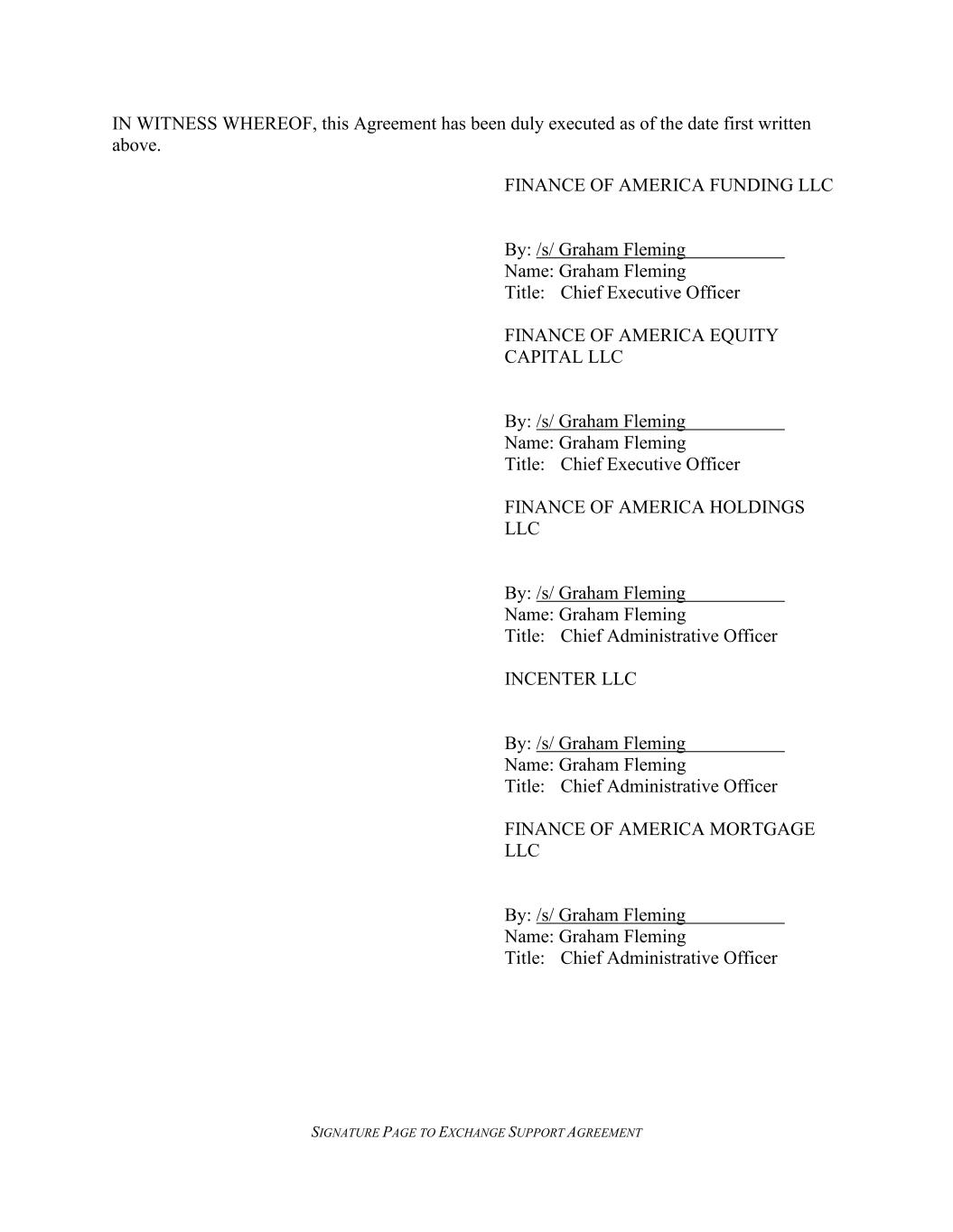 SIGNATURE PAGE TO EXCHANGE SUPPORT AGREEMENT IN WITNESS WHEREOF, this Agreement has been duly executed as of the date first written above. FINANCE OF AMERICA FUNDING LLC By: /s/ Graham Fleming Name: Graham Fleming Title: Chief Executive Officer FINANCE OF AMERICA EQUITY CAPITAL LLC By: /s/ Graham Fleming Name: Graham Fleming Title: Chief Executive Officer FINANCE OF AMERICA HOLDINGS LLC By: /s/ Graham Fleming Name: Graham Fleming Title: Chief Administrative Officer INCENTER LLC By: /s/ Graham Fleming Name: Graham Fleming Title: Chief Administrative Officer FINANCE OF AMERICA MORTGAGE LLC By: /s/ Graham Fleming Name: Graham Fleming Title: Chief Administrative Officer