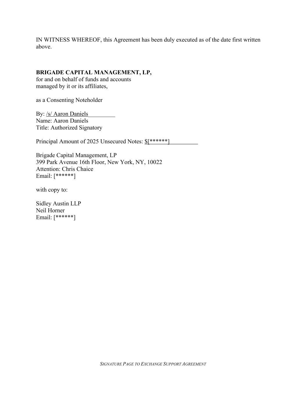 SIGNATURE PAGE TO EXCHANGE SUPPORT AGREEMENT IN WITNESS WHEREOF, this Agreement has been duly executed as of the date first written above. BRIGADE CAPITAL MANAGEMENT, LP, for and on behalf of funds and accounts managed by it or its affiliates, as a Consenting Noteholder By: /s/ Aaron Daniels_________ Name: Aaron Daniels Title: Authorized Signatory Principal Amount of 2025 Unsecured Notes: $[******] Brigade Capital Management, LP 399 Park Avenue 16th Floor, New York, NY, 10022 Attention: Chris Chaice Email: [******] with copy to: Sidley Austin LLP Neil Horner Email: [******]