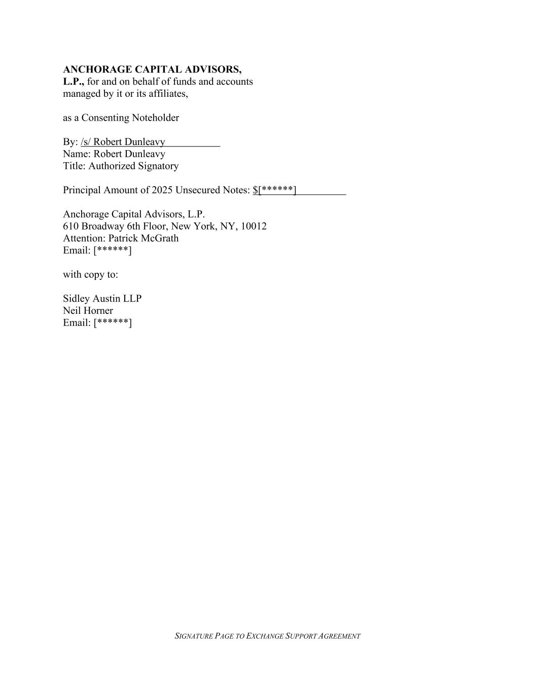 SIGNATURE PAGE TO EXCHANGE SUPPORT AGREEMENT ANCHORAGE CAPITAL ADVISORS, L.P., for and on behalf of funds and accounts managed by it or its affiliates, as a Consenting Noteholder By: /s/ Robert Dunleavy Name: Robert Dunleavy Title: Authorized Signatory Principal Amount of 2025 Unsecured Notes: $[******] Anchorage Capital Advisors, L.P. 610 Broadway 6th Floor, New York, NY, 10012 Attention: Patrick McGrath Email: [******] with copy to: Sidley Austin LLP Neil Horner Email: [******]
