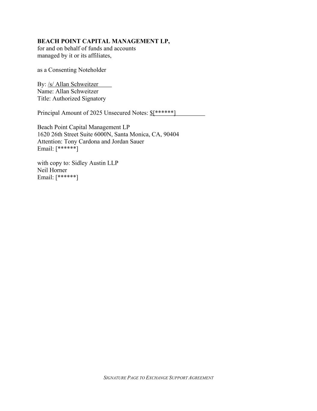 SIGNATURE PAGE TO EXCHANGE SUPPORT AGREEMENT BEACH POINT CAPITAL MANAGEMENT LP, for and on behalf of funds and accounts managed by it or its affiliates, as a Consenting Noteholder By: /s/ Allan Schweitzer Name: Allan Schweitzer Title: Authorized Signatory Principal Amount of 2025 Unsecured Notes: $[******] Beach Point Capital Management LP 1620 26th Street Suite 6000N, Santa Monica, CA, 90404 Attention: Tony Cardona and Jordan Sauer Email: [******] with copy to: Sidley Austin LLP Neil Horner Email: [******]