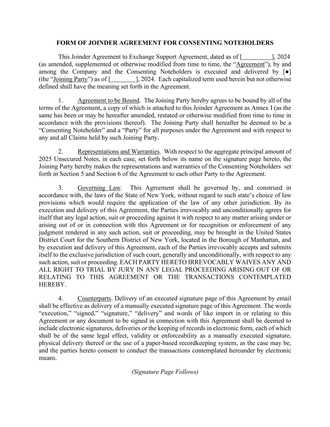 FORM OF JOINDER AGREEMENT FOR CONSENTING NOTEHOLDERS This Joinder Agreement to Exchange Support Agreement, dated as of [ ], 2024 (as amended, supplemented or otherwise modified from time to time, the “Agreement”), by and among the Company and the Consenting Noteholders is executed and delivered by [●] (the “Joining Party”) as of [ ], 2024. Each capitalized term used herein but not otherwise defined shall have the meaning set forth in the Agreement. 1. Agreement to be Bound. The Joining Party hereby agrees to be bound by all of the terms of the Agreement, a copy of which is attached to this Joinder Agreement as Annex I (as the same has been or may be hereafter amended, restated or otherwise modified from time to time in accordance with the provisions thereof). The Joining Party shall hereafter be deemed to be a “Consenting Noteholder” and a “Party” for all purposes under the Agreement and with respect to any and all Claims held by such Joining Party. 2. Representations and Warranties. With respect to the aggregate principal amount of 2025 Unsecured Notes, in each case, set forth below its name on the signature page hereto, the Joining Party hereby makes the representations and warranties of the Consenting Noteholders set forth in Section 5 and Section 6 of the Agreement to each other Party to the Agreement. 3. Governing Law. This Agreement shall be governed by, and construed in accordance with, the laws of the State of New York, without regard to such state’s choice of law provisions which would require the application of the law of any other jurisdiction. By its execution and delivery of this Agreement, the Parties irrevocably and unconditionally agrees for itself that any legal action, suit or proceeding against it with respect to any matter arising under or arising out of or in connection with this Agreement or for recognition or enforcement of any judgment rendered in any such action, suit or proceeding, may be brought in the United States District Court for the Southern District of New York, located in the Borough of Manhattan, and by execution and delivery of this Agreement, each of the Parties irrevocably accepts and submits itself to the exclusive jurisdiction of such court, generally and unconditionally, with respect to any such action, suit or proceeding. EACH PARTY HERETO IRREVOCABLY WAIVES ANY AND ALL RIGHT TO TRIAL BY JURY IN ANY LEGAL PROCEEDING ARISING OUT OF OR RELATING TO THIS AGREEMENT OR THE TRANSACTIONS CONTEMPLATED HEREBY. 4. Counterparts. Delivery of an executed signature page of this Agreement by email shall be effective as delivery of a manually executed signature page of this Agreement. The words “execution,” “signed,” “signature,” “delivery” and words of like import in or relating to this Agreement or any document to be signed in connection with this Agreement shall be deemed to include electronic signatures, deliveries or the keeping of records in electronic form, each of which shall be of the same legal effect, validity or enforceability as a manually executed signature, physical delivery thereof or the use of a paper-based recordkeeping system, as the case may be, and the parties hereto consent to conduct the transactions contemplated hereunder by electronic means. (Signature Page Follows)