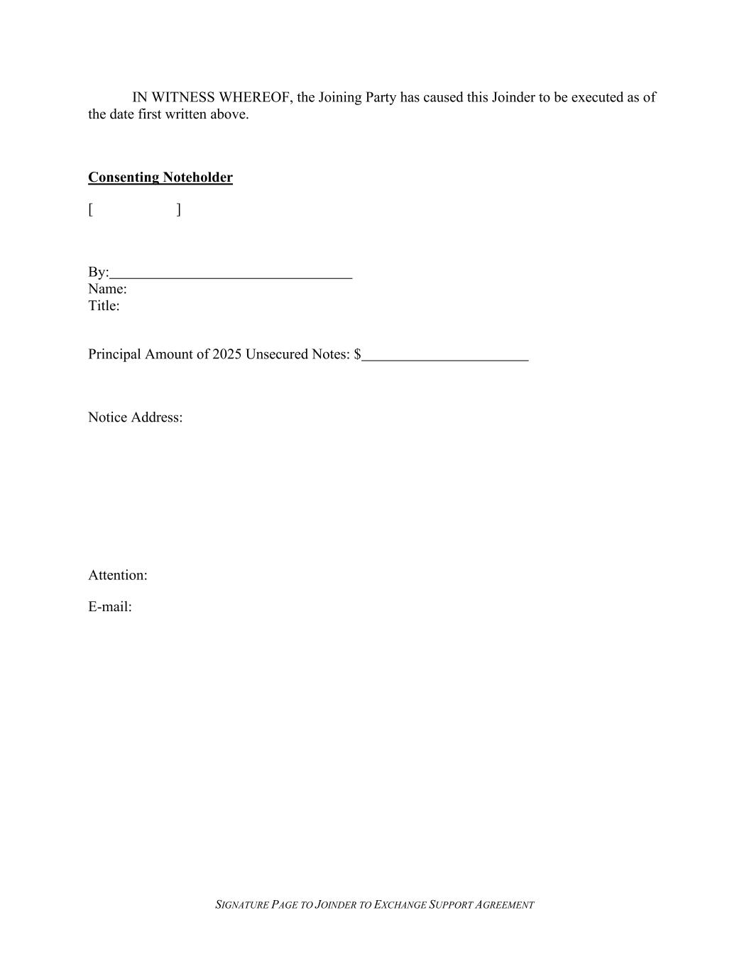 SIGNATURE PAGE TO JOINDER TO EXCHANGE SUPPORT AGREEMENT IN WITNESS WHEREOF, the Joining Party has caused this Joinder to be executed as of the date first written above. Consenting Noteholder [ ] By: Name: Title: Principal Amount of 2025 Unsecured Notes: $ Notice Address: Attention: E-mail: