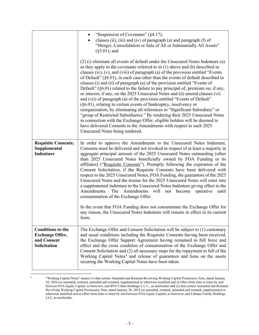 - 3 - 4 “Working Capital Notes” means (1) that certain Amended and Restated Revolving Working Capital Promissory Note, dated January 30, 2024 (as amended, restated, amended and restated, supplemented or otherwise modified and in effect from time to time) by and between FOA Equity Capital, as borrower, and BTO Urban Holdings L.L.C., as noteholder and (2) that certain Amended and Restated Revolving Working Capital Promissory Note, dated January 30, 2024 (as amended, restated, amended and restated, supplemented or otherwise modified and in effect from time to time) by and between FOA Equity Capital, as borrower, and Libman Family Holdings, LLC, as noteholder. • “Suspension of Covenants” (§4.17); • clauses (ii), (iii) and (iv) of paragraph (a) and paragraph (f) of “Merger, Consolidation or Sale of All or Substantially All Assets” (§5.01); and (2) (i) eliminate all events of default under the Unsecured Notes Indenture (a) as they apply to the covenants referred to in (1) above and (b) described in clauses (iv), (v), and (viii) of paragraph (a) of the provision entitled “Events of Default” (§6.01), in each case other than the events of default described in clauses (i) and (ii) of paragraph (a) of the provision entitled “Events of Default” (§6.01) related to the failure to pay principal of, premium on, if any, or interest, if any, on the 2025 Unsecured Notes and (ii) amend clauses (vi) and (vii) of paragraph (a) of the provision entitled “Events of Default” (§6.01), relating to certain events of bankruptcy, insolvency or reorganization, by eliminating all references to “Significant Subsidiary” or “group of Restricted Subsidiaries.” By tendering their 2025 Unsecured Notes in connection with the Exchange Offer, eligible holders will be deemed to have delivered Consents to the Amendments with respect to such 2025 Unsecured Notes being tendered. Requisite Consents; Supplemental Indenture In order to approve the Amendments to the Unsecured Notes Indenture, Consents must be delivered and not revoked in respect of at least a majority in aggregate principal amount of the 2025 Unsecured Notes outstanding (other than 2025 Unsecured Notes beneficially owned by FOA Funding or its affiliates) (“Requisite Consents”). Promptly following the expiration of the Consent Solicitation, if the Requisite Consents have been delivered with respect to the 2025 Unsecured Notes, FOA Funding, the guarantors of the 2025 Unsecured Notes and the trustee for the 2025 Unsecured Notes will enter into a supplemental indenture to the Unsecured Notes Indenture giving effect to the Amendments. The Amendments will not become operative until consummation of the Exchange Offer. In the event that FOA Funding does not consummate the Exchange Offer for any reason, the Unsecured Notes Indenture will remain in effect in its current form. Conditions to the Exchange Offer, and Consent Solicitation The Exchange Offer and Consent Solicitation will be subject to (1) customary and usual conditions including the Requisite Consents having been received, the Exchange Offer Support Agreement having remained in full force and effect and the cross condition of consummation of the Exchange Offer and Consent Solicitation and (2) all necessary steps for the repayment in full of the Working Capital Notes4 and release of guarantees and liens on the assets securing the Working Capital Notes have been taken.