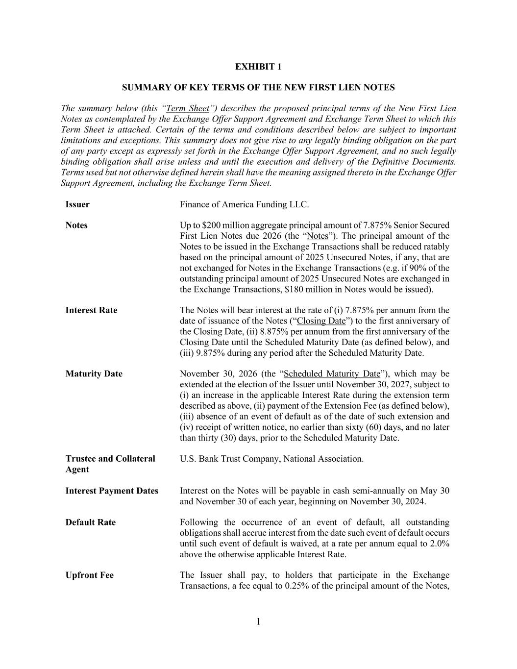 1 EXHIBIT 1 SUMMARY OF KEY TERMS OF THE NEW FIRST LIEN NOTES The summary below (this “Term Sheet”) describes the proposed principal terms of the New First Lien Notes as contemplated by the Exchange Offer Support Agreement and Exchange Term Sheet to which this Term Sheet is attached. Certain of the terms and conditions described below are subject to important limitations and exceptions. This summary does not give rise to any legally binding obligation on the part of any party except as expressly set forth in the Exchange Offer Support Agreement, and no such legally binding obligation shall arise unless and until the execution and delivery of the Definitive Documents. Terms used but not otherwise defined herein shall have the meaning assigned thereto in the Exchange Offer Support Agreement, including the Exchange Term Sheet. Issuer Finance of America Funding LLC. Notes Up to $200 million aggregate principal amount of 7.875% Senior Secured First Lien Notes due 2026 (the “Notes”). The principal amount of the Notes to be issued in the Exchange Transactions shall be reduced ratably based on the principal amount of 2025 Unsecured Notes, if any, that are not exchanged for Notes in the Exchange Transactions (e.g. if 90% of the outstanding principal amount of 2025 Unsecured Notes are exchanged in the Exchange Transactions, $180 million in Notes would be issued). Interest Rate The Notes will bear interest at the rate of (i) 7.875% per annum from the date of issuance of the Notes (“Closing Date”) to the first anniversary of the Closing Date, (ii) 8.875% per annum from the first anniversary of the Closing Date until the Scheduled Maturity Date (as defined below), and (iii) 9.875% during any period after the Scheduled Maturity Date. Maturity Date November 30, 2026 (the “Scheduled Maturity Date”), which may be extended at the election of the Issuer until November 30, 2027, subject to (i) an increase in the applicable Interest Rate during the extension term described as above, (ii) payment of the Extension Fee (as defined below), (iii) absence of an event of default as of the date of such extension and (iv) receipt of written notice, no earlier than sixty (60) days, and no later than thirty (30) days, prior to the Scheduled Maturity Date. Trustee and Collateral Agent U.S. Bank Trust Company, National Association. Interest Payment Dates Interest on the Notes will be payable in cash semi-annually on May 30 and November 30 of each year, beginning on November 30, 2024. Default Rate Following the occurrence of an event of default, all outstanding obligations shall accrue interest from the date such event of default occurs until such event of default is waived, at a rate per annum equal to 2.0% above the otherwise applicable Interest Rate. Upfront Fee The Issuer shall pay, to holders that participate in the Exchange Transactions, a fee equal to 0.25% of the principal amount of the Notes,