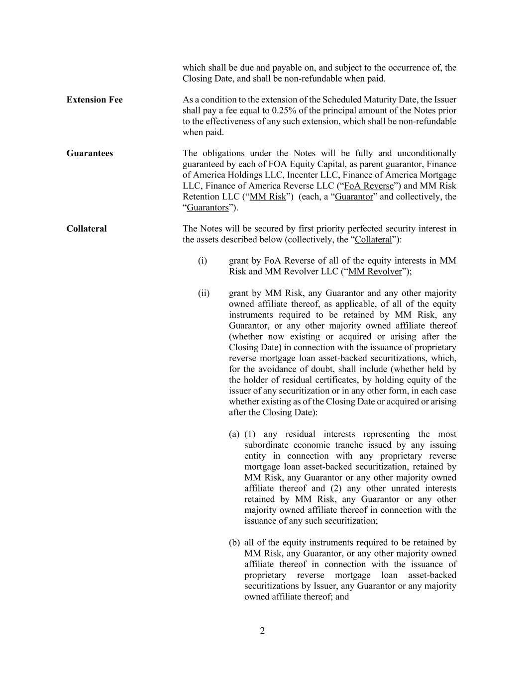 2 which shall be due and payable on, and subject to the occurrence of, the Closing Date, and shall be non-refundable when paid. Extension Fee As a condition to the extension of the Scheduled Maturity Date, the Issuer shall pay a fee equal to 0.25% of the principal amount of the Notes prior to the effectiveness of any such extension, which shall be non-refundable when paid. Guarantees The obligations under the Notes will be fully and unconditionally guaranteed by each of FOA Equity Capital, as parent guarantor, Finance of America Holdings LLC, Incenter LLC, Finance of America Mortgage LLC, Finance of America Reverse LLC (“FoA Reverse”) and MM Risk Retention LLC (“MM Risk”) (each, a “Guarantor” and collectively, the “Guarantors”). Collateral The Notes will be secured by first priority perfected security interest in the assets described below (collectively, the “Collateral”): (i) grant by FoA Reverse of all of the equity interests in MM Risk and MM Revolver LLC (“MM Revolver”); (ii) grant by MM Risk, any Guarantor and any other majority owned affiliate thereof, as applicable, of all of the equity instruments required to be retained by MM Risk, any Guarantor, or any other majority owned affiliate thereof (whether now existing or acquired or arising after the Closing Date) in connection with the issuance of proprietary reverse mortgage loan asset-backed securitizations, which, for the avoidance of doubt, shall include (whether held by the holder of residual certificates, by holding equity of the issuer of any securitization or in any other form, in each case whether existing as of the Closing Date or acquired or arising after the Closing Date): (a) (1) any residual interests representing the most subordinate economic tranche issued by any issuing entity in connection with any proprietary reverse mortgage loan asset-backed securitization, retained by MM Risk, any Guarantor or any other majority owned affiliate thereof and (2) any other unrated interests retained by MM Risk, any Guarantor or any other majority owned affiliate thereof in connection with the issuance of any such securitization; (b) all of the equity instruments required to be retained by MM Risk, any Guarantor, or any other majority owned affiliate thereof in connection with the issuance of proprietary reverse mortgage loan asset-backed securitizations by Issuer, any Guarantor or any majority owned affiliate thereof; and