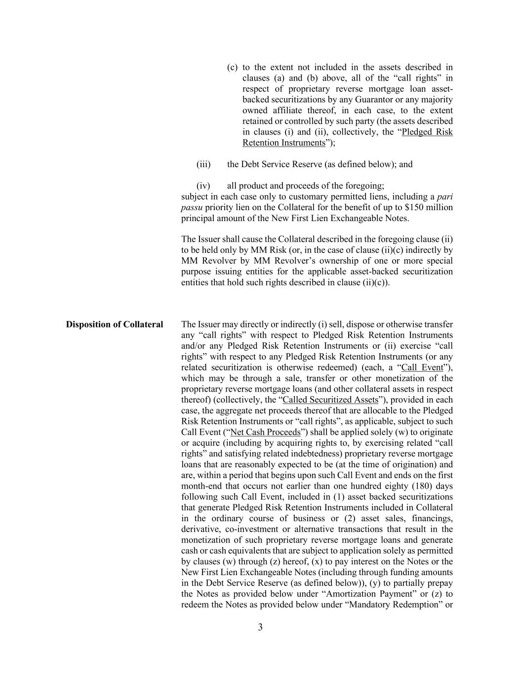 3 (c) to the extent not included in the assets described in clauses (a) and (b) above, all of the “call rights” in respect of proprietary reverse mortgage loan asset- backed securitizations by any Guarantor or any majority owned affiliate thereof, in each case, to the extent retained or controlled by such party (the assets described in clauses (i) and (ii), collectively, the “Pledged Risk Retention Instruments”); (iii) the Debt Service Reserve (as defined below); and (iv) all product and proceeds of the foregoing; subject in each case only to customary permitted liens, including a pari passu priority lien on the Collateral for the benefit of up to $150 million principal amount of the New First Lien Exchangeable Notes. The Issuer shall cause the Collateral described in the foregoing clause (ii) to be held only by MM Risk (or, in the case of clause (ii)(c) indirectly by MM Revolver by MM Revolver’s ownership of one or more special purpose issuing entities for the applicable asset-backed securitization entities that hold such rights described in clause (ii)(c)). Disposition of Collateral The Issuer may directly or indirectly (i) sell, dispose or otherwise transfer any “call rights” with respect to Pledged Risk Retention Instruments and/or any Pledged Risk Retention Instruments or (ii) exercise “call rights” with respect to any Pledged Risk Retention Instruments (or any related securitization is otherwise redeemed) (each, a “Call Event”), which may be through a sale, transfer or other monetization of the proprietary reverse mortgage loans (and other collateral assets in respect thereof) (collectively, the “Called Securitized Assets”), provided in each case, the aggregate net proceeds thereof that are allocable to the Pledged Risk Retention Instruments or “call rights”, as applicable, subject to such Call Event (“Net Cash Proceeds”) shall be applied solely (w) to originate or acquire (including by acquiring rights to, by exercising related “call rights” and satisfying related indebtedness) proprietary reverse mortgage loans that are reasonably expected to be (at the time of origination) and are, within a period that begins upon such Call Event and ends on the first month-end that occurs not earlier than one hundred eighty (180) days following such Call Event, included in (1) asset backed securitizations that generate Pledged Risk Retention Instruments included in Collateral in the ordinary course of business or (2) asset sales, financings, derivative, co-investment or alternative transactions that result in the monetization of such proprietary reverse mortgage loans and generate cash or cash equivalents that are subject to application solely as permitted by clauses (w) through (z) hereof, (x) to pay interest on the Notes or the New First Lien Exchangeable Notes (including through funding amounts in the Debt Service Reserve (as defined below)), (y) to partially prepay the Notes as provided below under “Amortization Payment” or (z) to redeem the Notes as provided below under “Mandatory Redemption” or
