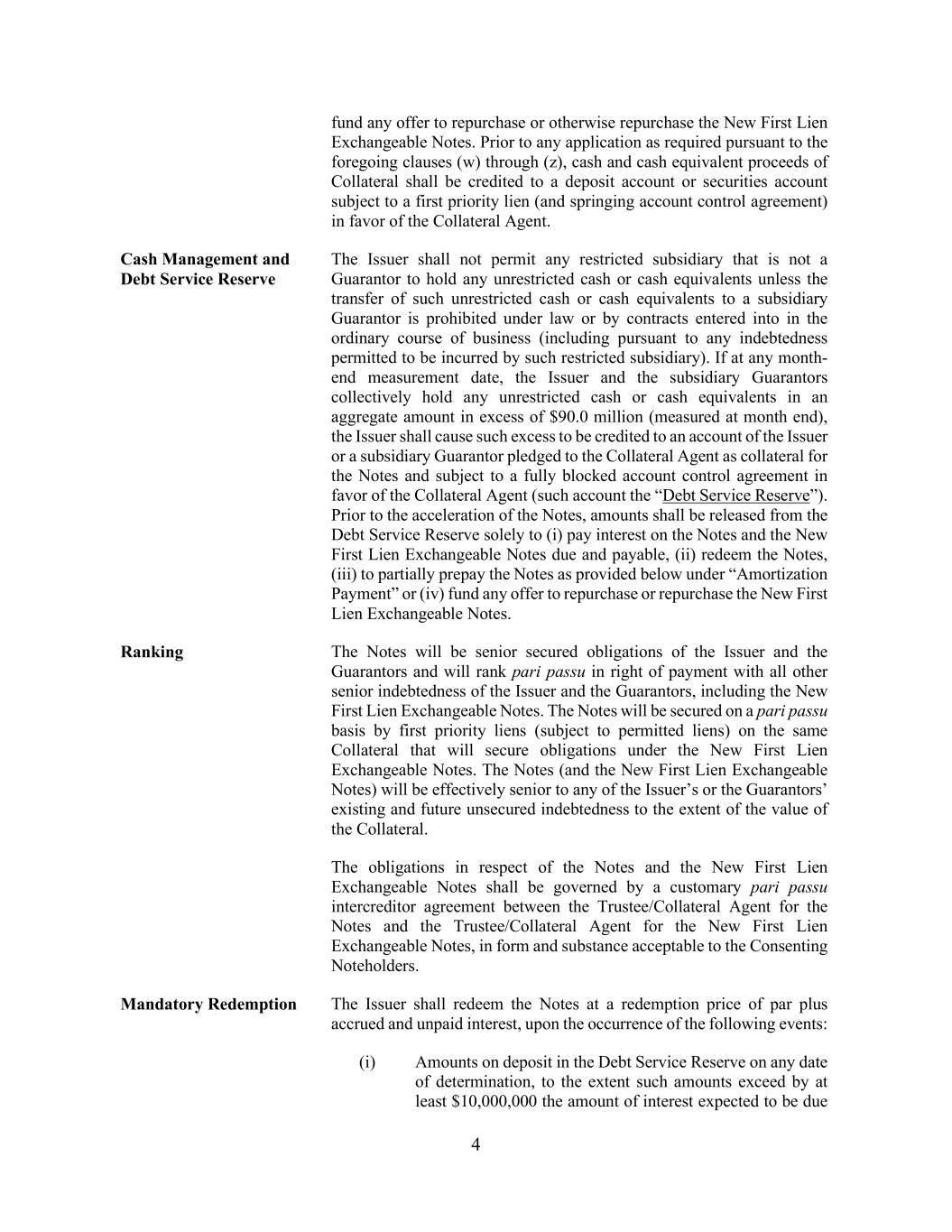4 fund any offer to repurchase or otherwise repurchase the New First Lien Exchangeable Notes. Prior to any application as required pursuant to the foregoing clauses (w) through (z), cash and cash equivalent proceeds of Collateral shall be credited to a deposit account or securities account subject to a first priority lien (and springing account control agreement) in favor of the Collateral Agent. Cash Management and Debt Service Reserve The Issuer shall not permit any restricted subsidiary that is not a Guarantor to hold any unrestricted cash or cash equivalents unless the transfer of such unrestricted cash or cash equivalents to a subsidiary Guarantor is prohibited under law or by contracts entered into in the ordinary course of business (including pursuant to any indebtedness permitted to be incurred by such restricted subsidiary). If at any month- end measurement date, the Issuer and the subsidiary Guarantors collectively hold any unrestricted cash or cash equivalents in an aggregate amount in excess of $90.0 million (measured at month end), the Issuer shall cause such excess to be credited to an account of the Issuer or a subsidiary Guarantor pledged to the Collateral Agent as collateral for the Notes and subject to a fully blocked account control agreement in favor of the Collateral Agent (such account the “Debt Service Reserve”). Prior to the acceleration of the Notes, amounts shall be released from the Debt Service Reserve solely to (i) pay interest on the Notes and the New First Lien Exchangeable Notes due and payable, (ii) redeem the Notes, (iii) to partially prepay the Notes as provided below under “Amortization Payment” or (iv) fund any offer to repurchase or repurchase the New First Lien Exchangeable Notes. Ranking The Notes will be senior secured obligations of the Issuer and the Guarantors and will rank pari passu in right of payment with all other senior indebtedness of the Issuer and the Guarantors, including the New First Lien Exchangeable Notes. The Notes will be secured on a pari passu basis by first priority liens (subject to permitted liens) on the same Collateral that will secure obligations under the New First Lien Exchangeable Notes. The Notes (and the New First Lien Exchangeable Notes) will be effectively senior to any of the Issuer’s or the Guarantors’ existing and future unsecured indebtedness to the extent of the value of the Collateral. The obligations in respect of the Notes and the New First Lien Exchangeable Notes shall be governed by a customary pari passu intercreditor agreement between the Trustee/Collateral Agent for the Notes and the Trustee/Collateral Agent for the New First Lien Exchangeable Notes, in form and substance acceptable to the Consenting Noteholders. Mandatory Redemption The Issuer shall redeem the Notes at a redemption price of par plus accrued and unpaid interest, upon the occurrence of the following events: (i) Amounts on deposit in the Debt Service Reserve on any date of determination, to the extent such amounts exceed by at least $10,000,000 the amount of interest expected to be due