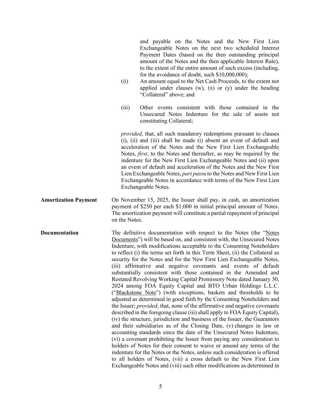 5 and payable on the Notes and the New First Lien Exchangeable Notes on the next two scheduled Interest Payment Dates (based on the then outstanding principal amount of the Notes and the then applicable Interest Rate), to the extent of the entire amount of such excess (including, for the avoidance of doubt, such $10,000,000); (ii) An amount equal to the Net Cash Proceeds, to the extent not applied under clauses (w), (x) or (y) under the heading “Collateral” above; and (iii) Other events consistent with those contained in the Unsecured Notes Indenture for the sale of assets not constituting Collateral; provided, that, all such mandatory redemptions pursuant to clauses (i), (ii) and (iii) shall be made (i) absent an event of default and acceleration of the Notes and the New First Lien Exchangeable Notes, first, to the Notes and thereafter, as may be required by the indenture for the New First Lien Exchangeable Notes and (ii) upon an event of default and acceleration of the Notes and the New First Lien Exchangeable Notes, pari passu to the Notes and New First Lien Exchangeable Notes in accordance with terms of the New First Lien Exchangeable Notes. Amortization Payment On November 15, 2025, the Issuer shall pay, in cash, an amortization payment of $250 per each $1,000 in initial principal amount of Notes. The amortization payment will constitute a partial repayment of principal on the Notes. Documentation The definitive documentation with respect to the Notes (the “Notes Documents”) will be based on, and consistent with, the Unsecured Notes Indenture, with modifications acceptable to the Consenting Noteholders to reflect (i) the terms set forth in this Term Sheet, (ii) the Collateral as security for the Notes and for the New First Lien Exchangeable Notes, (iii) affirmative and negative covenants and events of default substantially consistent with those contained in the Amended and Restated Revolving Working Capital Promissory Note dated January 30, 2024 among FOA Equity Capital and BTO Urban Holdings L.L.C. (“Blackstone Note”) (with exceptions, baskets and thresholds to be adjusted as determined in good faith by the Consenting Noteholders and the Issuer; provided, that, none of the affirmative and negative covenants described in the foregoing clause (iii) shall apply to FOA Equity Capital), (iv) the structure, jurisdiction and business of the Issuer, the Guarantors and their subsidiaries as of the Closing Date, (v) changes in law or accounting standards since the date of the Unsecured Notes Indenture, (vi) a covenant prohibiting the Issuer from paying any consideration to holders of Notes for their consent to waive or amend any terms of the indenture for the Notes or the Notes, unless such consideration is offered to all holders of Notes, (vii) a cross default to the New First Lien Exchangeable Notes and (viii) such other modifications as determined in
