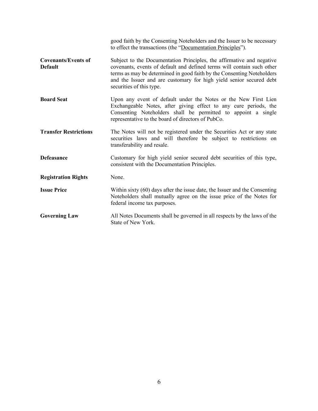 6 good faith by the Consenting Noteholders and the Issuer to be necessary to effect the transactions (the “Documentation Principles”). Covenants/Events of Default Subject to the Documentation Principles, the affirmative and negative covenants, events of default and defined terms will contain such other terms as may be determined in good faith by the Consenting Noteholders and the Issuer and are customary for high yield senior secured debt securities of this type. Board Seat Upon any event of default under the Notes or the New First Lien Exchangeable Notes, after giving effect to any cure periods, the Consenting Noteholders shall be permitted to appoint a single representative to the board of directors of PubCo. Transfer Restrictions The Notes will not be registered under the Securities Act or any state securities laws and will therefore be subject to restrictions on transferability and resale. Defeasance Customary for high yield senior secured debt securities of this type, consistent with the Documentation Principles. Registration Rights None. Issue Price Within sixty (60) days after the issue date, the Issuer and the Consenting Noteholders shall mutually agree on the issue price of the Notes for federal income tax purposes. Governing Law All Notes Documents shall be governed in all respects by the laws of the State of New York.