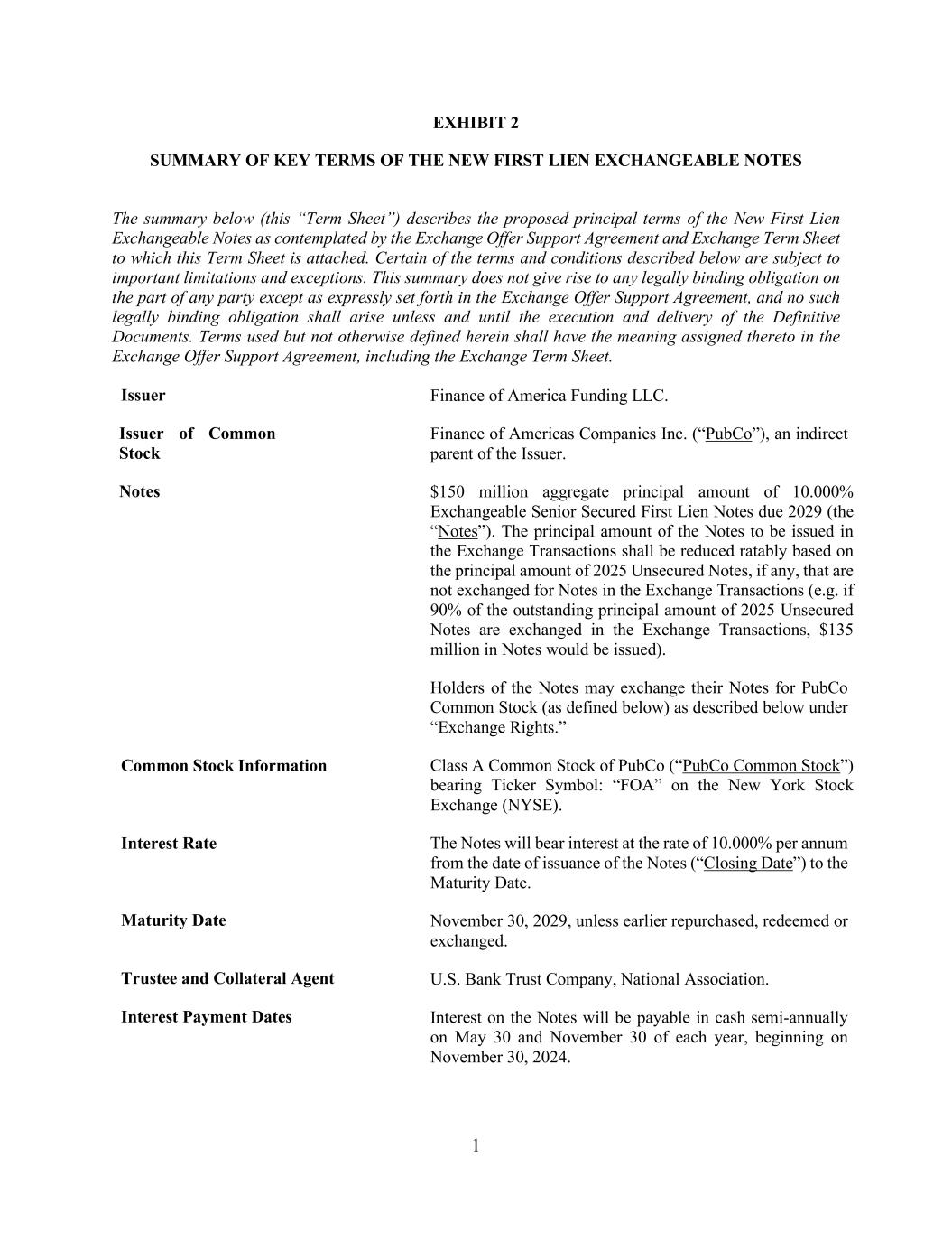 1 EXHIBIT 2 SUMMARY OF KEY TERMS OF THE NEW FIRST LIEN EXCHANGEABLE NOTES The summary below (this “Term Sheet”) describes the proposed principal terms of the New First Lien Exchangeable Notes as contemplated by the Exchange Offer Support Agreement and Exchange Term Sheet to which this Term Sheet is attached. Certain of the terms and conditions described below are subject to important limitations and exceptions. This summary does not give rise to any legally binding obligation on the part of any party except as expressly set forth in the Exchange Offer Support Agreement, and no such legally binding obligation shall arise unless and until the execution and delivery of the Definitive Documents. Terms used but not otherwise defined herein shall have the meaning assigned thereto in the Exchange Offer Support Agreement, including the Exchange Term Sheet. Issuer Finance of America Funding LLC. Issuer of Common Stock Finance of Americas Companies Inc. (“PubCo”), an indirect parent of the Issuer. Notes $150 million aggregate principal amount of 10.000% Exchangeable Senior Secured First Lien Notes due 2029 (the “Notes”). The principal amount of the Notes to be issued in the Exchange Transactions shall be reduced ratably based on the principal amount of 2025 Unsecured Notes, if any, that are not exchanged for Notes in the Exchange Transactions (e.g. if 90% of the outstanding principal amount of 2025 Unsecured Notes are exchanged in the Exchange Transactions, $135 million in Notes would be issued). Holders of the Notes may exchange their Notes for PubCo Common Stock (as defined below) as described below under “Exchange Rights.” Common Stock Information Class A Common Stock of PubCo (“PubCo Common Stock”) bearing Ticker Symbol: “FOA” on the New York Stock Exchange (NYSE). Interest Rate The Notes will bear interest at the rate of 10.000% per annum from the date of issuance of the Notes (“Closing Date”) to the Maturity Date. Maturity Date November 30, 2029, unless earlier repurchased, redeemed or exchanged. Trustee and Collateral Agent U.S. Bank Trust Company, National Association. Interest Payment Dates Interest on the Notes will be payable in cash semi-annually on May 30 and November 30 of each year, beginning on November 30, 2024.