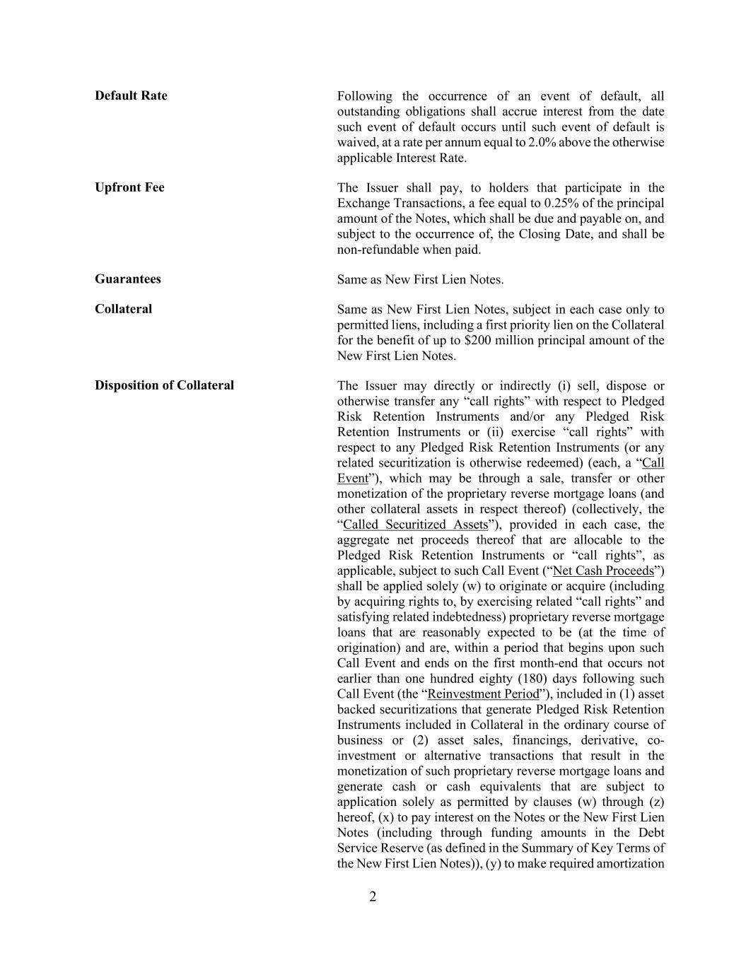 2 Default Rate Following the occurrence of an event of default, all outstanding obligations shall accrue interest from the date such event of default occurs until such event of default is waived, at a rate per annum equal to 2.0% above the otherwise applicable Interest Rate. Upfront Fee The Issuer shall pay, to holders that participate in the Exchange Transactions, a fee equal to 0.25% of the principal amount of the Notes, which shall be due and payable on, and subject to the occurrence of, the Closing Date, and shall be non-refundable when paid. Guarantees Same as New First Lien Notes. Collateral Same as New First Lien Notes, subject in each case only to permitted liens, including a first priority lien on the Collateral for the benefit of up to $200 million principal amount of the New First Lien Notes. Disposition of Collateral The Issuer may directly or indirectly (i) sell, dispose or otherwise transfer any “call rights” with respect to Pledged Risk Retention Instruments and/or any Pledged Risk Retention Instruments or (ii) exercise “call rights” with respect to any Pledged Risk Retention Instruments (or any related securitization is otherwise redeemed) (each, a “Call Event”), which may be through a sale, transfer or other monetization of the proprietary reverse mortgage loans (and other collateral assets in respect thereof) (collectively, the “Called Securitized Assets”), provided in each case, the aggregate net proceeds thereof that are allocable to the Pledged Risk Retention Instruments or “call rights”, as applicable, subject to such Call Event (“Net Cash Proceeds”) shall be applied solely (w) to originate or acquire (including by acquiring rights to, by exercising related “call rights” and satisfying related indebtedness) proprietary reverse mortgage loans that are reasonably expected to be (at the time of origination) and are, within a period that begins upon such Call Event and ends on the first month-end that occurs not earlier than one hundred eighty (180) days following such Call Event (the “Reinvestment Period”), included in (1) asset backed securitizations that generate Pledged Risk Retention Instruments included in Collateral in the ordinary course of business or (2) asset sales, financings, derivative, co- investment or alternative transactions that result in the monetization of such proprietary reverse mortgage loans and generate cash or cash equivalents that are subject to application solely as permitted by clauses (w) through (z) hereof, (x) to pay interest on the Notes or the New First Lien Notes (including through funding amounts in the Debt Service Reserve (as defined in the Summary of Key Terms of the New First Lien Notes)), (y) to make required amortization