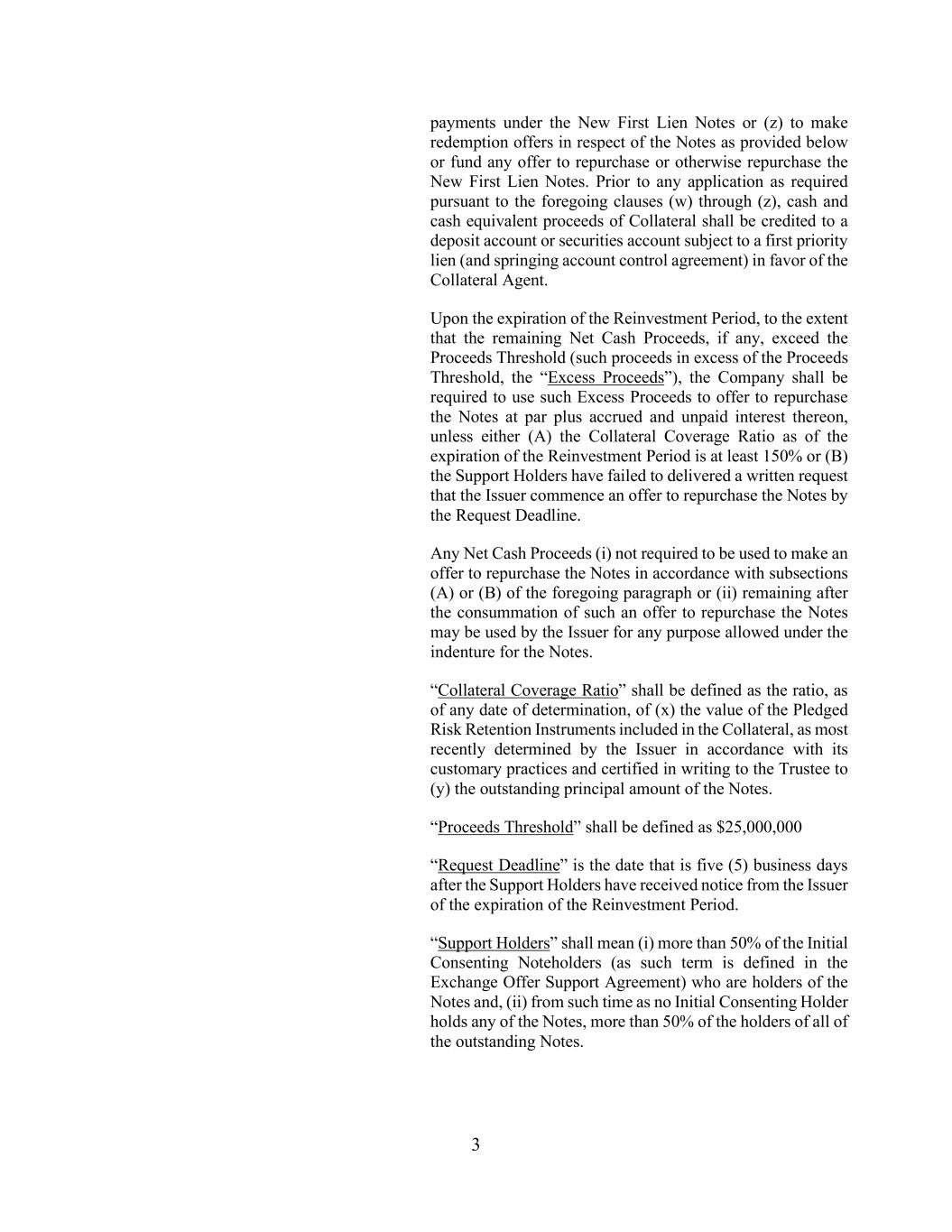 3 payments under the New First Lien Notes or (z) to make redemption offers in respect of the Notes as provided below or fund any offer to repurchase or otherwise repurchase the New First Lien Notes. Prior to any application as required pursuant to the foregoing clauses (w) through (z), cash and cash equivalent proceeds of Collateral shall be credited to a deposit account or securities account subject to a first priority lien (and springing account control agreement) in favor of the Collateral Agent. Upon the expiration of the Reinvestment Period, to the extent that the remaining Net Cash Proceeds, if any, exceed the Proceeds Threshold (such proceeds in excess of the Proceeds Threshold, the “Excess Proceeds”), the Company shall be required to use such Excess Proceeds to offer to repurchase the Notes at par plus accrued and unpaid interest thereon, unless either (A) the Collateral Coverage Ratio as of the expiration of the Reinvestment Period is at least 150% or (B) the Support Holders have failed to delivered a written request that the Issuer commence an offer to repurchase the Notes by the Request Deadline. Any Net Cash Proceeds (i) not required to be used to make an offer to repurchase the Notes in accordance with subsections (A) or (B) of the foregoing paragraph or (ii) remaining after the consummation of such an offer to repurchase the Notes may be used by the Issuer for any purpose allowed under the indenture for the Notes. “Collateral Coverage Ratio” shall be defined as the ratio, as of any date of determination, of (x) the value of the Pledged Risk Retention Instruments included in the Collateral, as most recently determined by the Issuer in accordance with its customary practices and certified in writing to the Trustee to (y) the outstanding principal amount of the Notes. “Proceeds Threshold” shall be defined as $25,000,000 “Request Deadline” is the date that is five (5) business days after the Support Holders have received notice from the Issuer of the expiration of the Reinvestment Period. “Support Holders” shall mean (i) more than 50% of the Initial Consenting Noteholders (as such term is defined in the Exchange Offer Support Agreement) who are holders of the Notes and, (ii) from such time as no Initial Consenting Holder holds any of the Notes, more than 50% of the holders of all of the outstanding Notes.