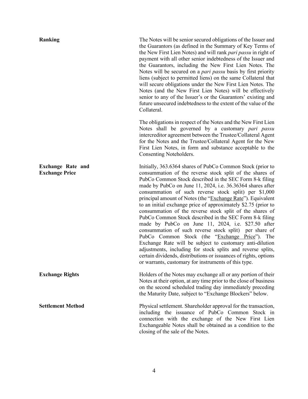 4 Ranking The Notes will be senior secured obligations of the Issuer and the Guarantors (as defined in the Summary of Key Terms of the New First Lien Notes) and will rank pari passu in right of payment with all other senior indebtedness of the Issuer and the Guarantors, including the New First Lien Notes. The Notes will be secured on a pari passu basis by first priority liens (subject to permitted liens) on the same Collateral that will secure obligations under the New First Lien Notes. The Notes (and the New First Lien Notes) will be effectively senior to any of the Issuer’s or the Guarantors’ existing and future unsecured indebtedness to the extent of the value of the Collateral. The obligations in respect of the Notes and the New First Lien Notes shall be governed by a customary pari passu intercreditor agreement between the Trustee/Collateral Agent for the Notes and the Trustee/Collateral Agent for the New First Lien Notes, in form and substance acceptable to the Consenting Noteholders. Exchange Rate and Exchange Price Initially, 363.6364 shares of PubCo Common Stock (prior to consummation of the reverse stock split of the shares of PubCo Common Stock described in the SEC Form 8-k filing made by PubCo on June 11, 2024, i.e. 36.36364 shares after consummation of such reverse stock split) per $1,000 principal amount of Notes (the “Exchange Rate”). Equivalent to an initial exchange price of approximately $2.75 (prior to consummation of the reverse stock split of the shares of PubCo Common Stock described in the SEC Form 8-k filing made by PubCo on June 11, 2024, i.e. $27.50 after consummation of such reverse stock split) per share of PubCo Common Stock (the “Exchange Price”). The Exchange Rate will be subject to customary anti-dilution adjustments, including for stock splits and reverse splits, certain dividends, distributions or issuances of rights, options or warrants, customary for instruments of this type. Exchange Rights Holders of the Notes may exchange all or any portion of their Notes at their option, at any time prior to the close of business on the second scheduled trading day immediately preceding the Maturity Date, subject to “Exchange Blockers” below. Settlement Method Physical settlement. Shareholder approval for the transaction, including the issuance of PubCo Common Stock in connection with the exchange of the New First Lien Exchangeable Notes shall be obtained as a condition to the closing of the sale of the Notes.