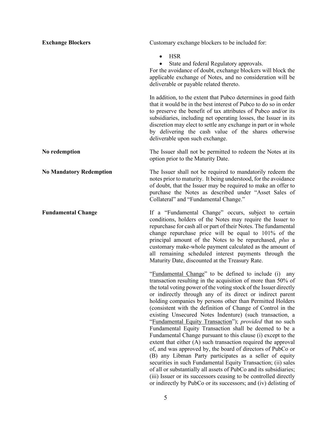 5 Exchange Blockers Customary exchange blockers to be included for: • HSR • State and federal Regulatory approvals. For the avoidance of doubt, exchange blockers will block the applicable exchange of Notes, and no consideration will be deliverable or payable related thereto. In addition, to the extent that Pubco determines in good faith that it would be in the best interest of Pubco to do so in order to preserve the benefit of tax attributes of Pubco and/or its subsidiaries, including net operating losses, the Issuer in its discretion may elect to settle any exchange in part or in whole by delivering the cash value of the shares otherwise deliverable upon such exchange. No redemption The Issuer shall not be permitted to redeem the Notes at its option prior to the Maturity Date. No Mandatory Redemption The Issuer shall not be required to mandatorily redeem the notes prior to maturity. It being understood, for the avoidance of doubt, that the Issuer may be required to make an offer to purchase the Notes as described under “Asset Sales of Collateral” and “Fundamental Change.” Fundamental Change If a “Fundamental Change” occurs, subject to certain conditions, holders of the Notes may require the Issuer to repurchase for cash all or part of their Notes. The fundamental change repurchase price will be equal to 101% of the principal amount of the Notes to be repurchased, plus a customary make-whole payment calculated as the amount of all remaining scheduled interest payments through the Maturity Date, discounted at the Treasury Rate. “Fundamental Change” to be defined to include (i) any transaction resulting in the acquisition of more than 50% of the total voting power of the voting stock of the Issuer directly or indirectly through any of its direct or indirect parent holding companies by persons other than Permitted Holders (consistent with the definition of Change of Control in the existing Unsecured Notes Indenture) (such transaction, a “Fundamental Equity Transaction”); provided that no such Fundamental Equity Transaction shall be deemed to be a Fundamental Change pursuant to this clause (i) except to the extent that either (A) such transaction required the approval of, and was approved by, the board of directors of PubCo or (B) any Libman Party participates as a seller of equity securities in such Fundamental Equity Transaction; (ii) sales of all or substantially all assets of PubCo and its subsidiaries; (iii) Issuer or its successors ceasing to be controlled directly or indirectly by PubCo or its successors; and (iv) delisting of