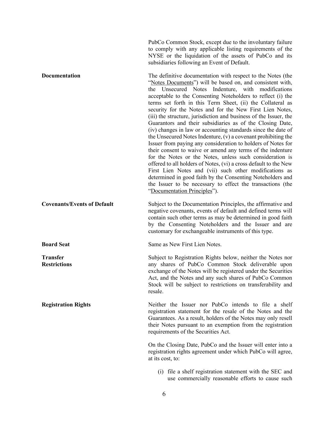 6 PubCo Common Stock, except due to the involuntary failure to comply with any applicable listing requirements of the NYSE or the liquidation of the assets of PubCo and its subsidiaries following an Event of Default. Documentation The definitive documentation with respect to the Notes (the “Notes Documents”) will be based on, and consistent with, the Unsecured Notes Indenture, with modifications acceptable to the Consenting Noteholders to reflect (i) the terms set forth in this Term Sheet, (ii) the Collateral as security for the Notes and for the New First Lien Notes, (iii) the structure, jurisdiction and business of the Issuer, the Guarantors and their subsidiaries as of the Closing Date, (iv) changes in law or accounting standards since the date of the Unsecured Notes Indenture, (v) a covenant prohibiting the Issuer from paying any consideration to holders of Notes for their consent to waive or amend any terms of the indenture for the Notes or the Notes, unless such consideration is offered to all holders of Notes, (vi) a cross default to the New First Lien Notes and (vii) such other modifications as determined in good faith by the Consenting Noteholders and the Issuer to be necessary to effect the transactions (the “Documentation Principles”). Covenants/Events of Default Subject to the Documentation Principles, the affirmative and negative covenants, events of default and defined terms will contain such other terms as may be determined in good faith by the Consenting Noteholders and the Issuer and are customary for exchangeable instruments of this type. Board Seat Same as New First Lien Notes. Transfer Restrictions Subject to Registration Rights below, neither the Notes nor any shares of PubCo Common Stock deliverable upon exchange of the Notes will be registered under the Securities Act, and the Notes and any such shares of PubCo Common Stock will be subject to restrictions on transferability and resale. Registration Rights Neither the Issuer nor PubCo intends to file a shelf registration statement for the resale of the Notes and the Guarantees. As a result, holders of the Notes may only resell their Notes pursuant to an exemption from the registration requirements of the Securities Act. On the Closing Date, PubCo and the Issuer will enter into a registration rights agreement under which PubCo will agree, at its cost, to: (i) file a shelf registration statement with the SEC and use commercially reasonable efforts to cause such