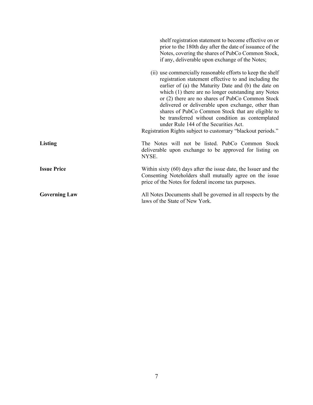 7 shelf registration statement to become effective on or prior to the 180th day after the date of issuance of the Notes, covering the shares of PubCo Common Stock, if any, deliverable upon exchange of the Notes; (ii) use commercially reasonable efforts to keep the shelf registration statement effective to and including the earlier of (a) the Maturity Date and (b) the date on which (1) there are no longer outstanding any Notes or (2) there are no shares of PubCo Common Stock delivered or deliverable upon exchange, other than shares of PubCo Common Stock that are eligible to be transferred without condition as contemplated under Rule 144 of the Securities Act. Registration Rights subject to customary “blackout periods.” Listing The Notes will not be listed. PubCo Common Stock deliverable upon exchange to be approved for listing on NYSE. Issue Price Within sixty (60) days after the issue date, the Issuer and the Consenting Noteholders shall mutually agree on the issue price of the Notes for federal income tax purposes. Governing Law All Notes Documents shall be governed in all respects by the laws of the State of New York.