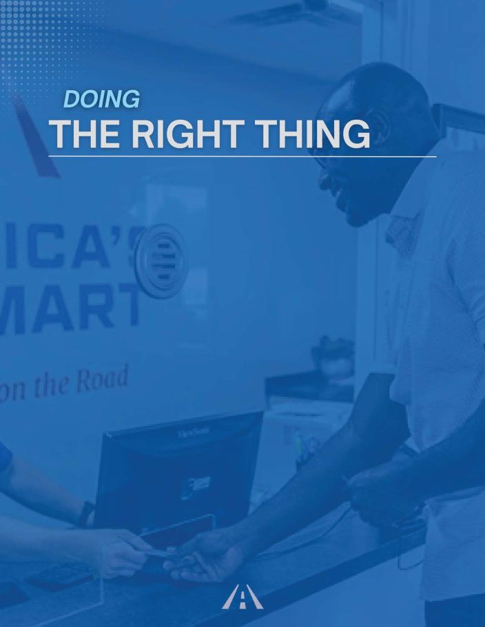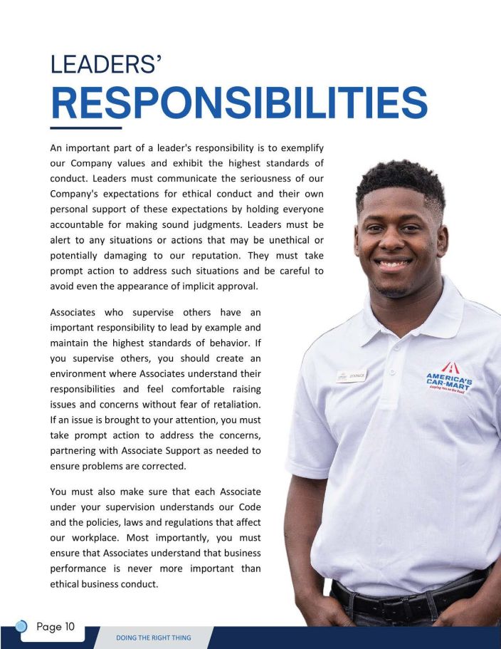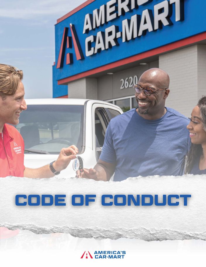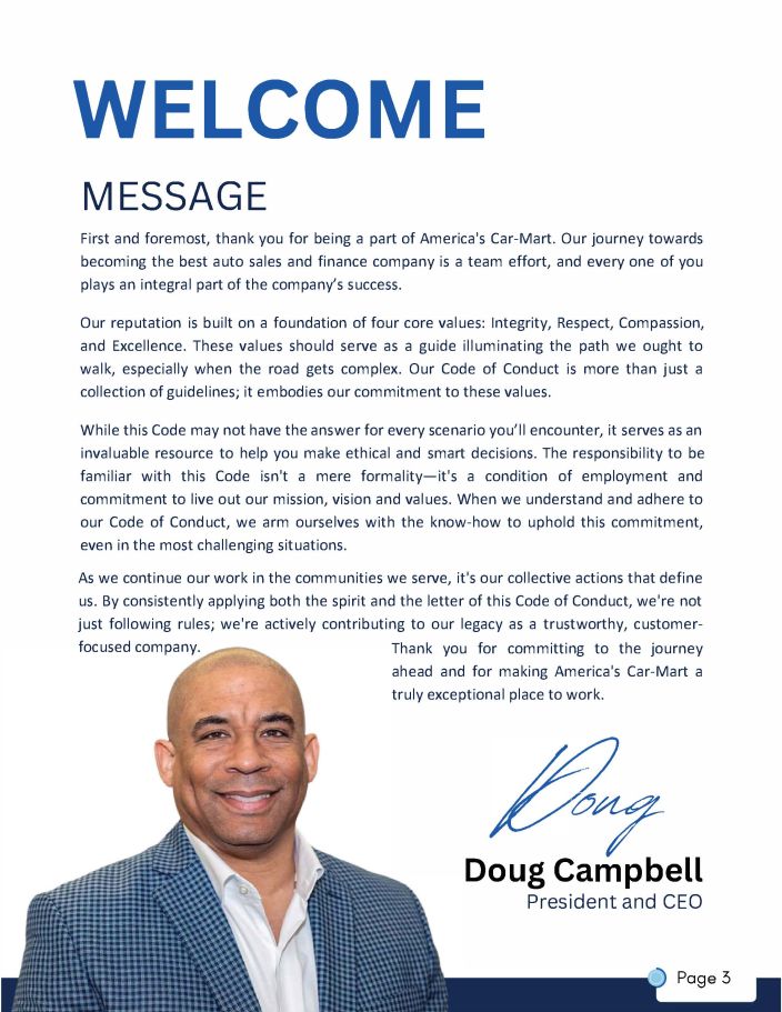 WELCOME MESSAGE First and foremost, thank you for being a part of America's Car - Mart . Our journey towards becoming the best auto sales and finance company is a team effort, and every one of you plays an integral part of the company's success . Our reputation is built on a foundation of four core values : Integrity, Respect, Compassion, and Excellence . These values should serve as a guide illuminating the path we ought to walk, especially when the road gets complex . Our Code of Conduct is more than just a collection of guidelines ; it embodies our commitment to these values . While this Code may not have the answer for every scenario you'll encounter, it serves as an invaluable resource to help you make ethical and smart decisions . The responsibility to be familiar with this Code isn't a mere formality - it's a condition of employment and commitment to live out our mission, vision and values . When we understand and adhere to our Code of Conduct, we arm ourselves with the know - how to uphold this commitment, even in the most challenging situations . As we continue our work in the communities we serve, it's our collective actions that define us . By consistently applying both the spirit and the letter of this Code of Conduct, we're not just following rules ; we're actively contributing to our legacy as a trustworthy, customer focused company. Thank you for committing to the journey ahead and for making America's Car - Mart a truly exceptional place to work . ೦ 7 Doug Campbell President and CEO Page 3