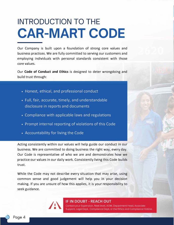 INTRODUCTION TO THE CAR - MART CODE Our Company is built upon a foundation of strong core values and business practices . We are fully committed to serving our customers and employing individuals with personal standards consistent with those core values . Our Code of Conduct and Ethics is designed to deter wrongdoing and build trust through : • Honest, ethical, and professional conduct • Full, fair, accurate, timely, and understandable disclosure in reports and documents • Compliance with applicable laws and regulations • Prompt internal reporting of violations of this Code • Accountability for living the Code Acting consistently within our values will help guide our conduct in our business . We are committed to doing business the right way, every day . Our Code is representative of who we are and demonstrates how we practice our values in our daily work . Consistently living this Code builds trust . While the Code may not describe every situation that may arise, using common sense and good judgement will help you in your decision making . If you are unsure of how this applies, it is your responsibility to seek guidance . Page 4 IF IN DOUBT - REACH OUT Contact your Supervisor, Next level, AOM, Department Head, Associate Support, Legal Dept, Compliance Dept, or the Ethics and Compliance Hotline.