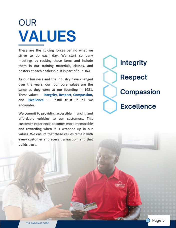 OUR VAL UES These are the guiding forces behind what we strive to meetings them in do each day . We start company by reciting these items and include our training materials, classes, and posters at each dealership. It is part of our DNA. As our business and the industry have changed over the years, our four core values are the same as they were at our founding in 1981 . These values - Integrity , Respect , Compassion , and Excellence - instill trust in all we encounter . We commit to providing accessible financing and affordable vehicles to our customers . This customer experience becomes more memorable and rewarding when it is wrapped up in our values . We ensure that these values remain with every customer and every transaction, and that builds trust . Integrity Respect Compassion Excellence THE CAR - MART CODE Page 5