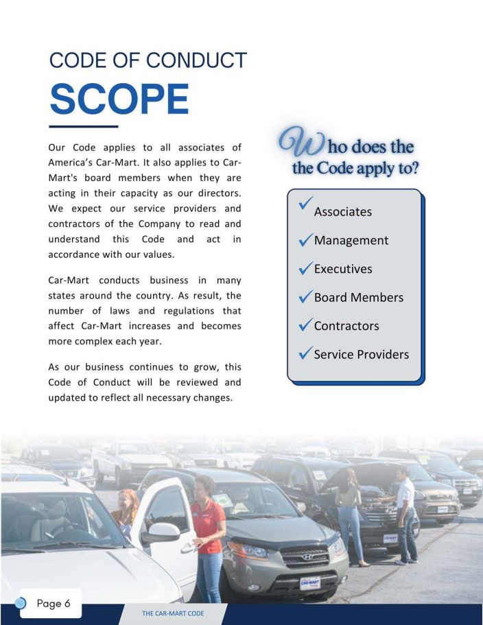 CODE OF CONDUCT SCOPE Our Code applies to all associates of America's Car - Mart . It also applies to Car Mart's board members when they are acting in their capacity as our directors . our service providers and of the Company to read and We expect contractors understand this Code and act in accordance with our values. Car - Mart conducts business in many states around the country. As result, the number of laws and regulations that affect Car - Mart increases and becomes more complex each year . As our business continues Code of Conduct will be to grow, this reviewed and updated to reflect all necessary changes. ho does the the Code apply to? "I Associates Management Executives Board Members Contractors Service Providers Page 6 THE CAR - MART CODE