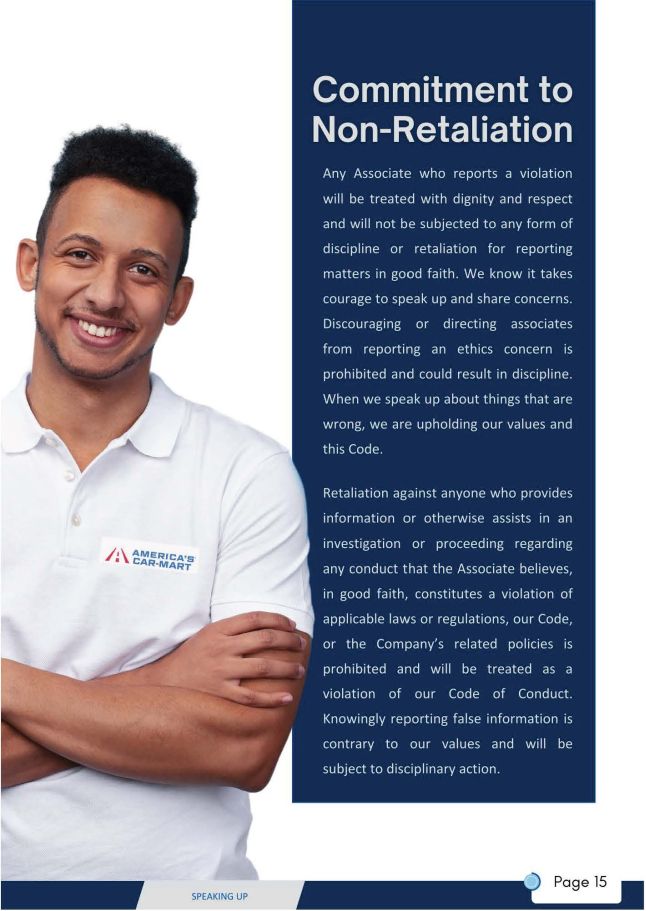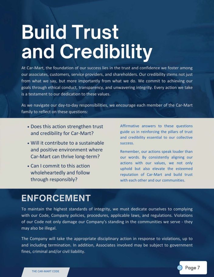 Build Trust and Credibility At Car - Mart, the foundation of our success lies in the trust and confidence we foster among our associates, customers, service providers, and shareholders. Our credibility stems not just rom f what we say, but more importantly from what we do. We commit to achieving our goals through ethical conduct, transparency, and unwavering integrity. Every action we take is a testament to our dedication to these values. of the Car - Mart encourage each member navigate our day - to - day responsibilities, we As we to reflect on these questions: family • Does this action strengthen trust and credibility for Car - Mart? • Will it contribute to a sustainable and positive environment where Car - Mart can thrive long - term? • Can I commit to this action wholeheartedly and follow through responsibly? Affirmative answers to these questions guide us in reinforcing the pillars of trust and credibility essential to our collective success . Remember, our actions speak louder than our words . By consistently aligning our actions with our values, we not only uphold but also elevate the esteemed reputation of Car - Mart and build trust with each other and our communities . ENFORCEMENT To maintain the highest standards of integrity, we must dedicate ourselves to complying with our Code, Company policies, procedures, applicable laws, and regulations . Violations of our Code not only damage our Company's standing in the communities we serve - they may also be illegal. to up response to violations, The Company will take the appropriate disciplinary action in government be subject to and including termination. In addition, Associates involved may criminal and/or civil liability. fines, THE CAR - MART CODE 1 1 Pa g 1 e 7 1