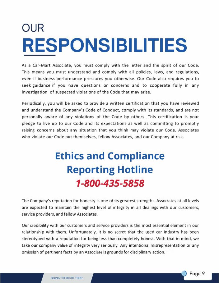 OUR RESPONSIBILITIES DOING THE RIGHT THING As a Car - Mart Associate, you must comply with the letter and the spirit of our Code . This means you must understand and comply with all policies, laws, and regulations, even if business performance pressures you otherwise . Our Code also requires you to seek guidance if you have questions or concerns and to cooperate fully in any investigation of suspected violations of the Code that may arise . Periodically, you will be asked to provide a written certification that you have reviewed and understand the Company's Code of Conduct, comply with its standards, and are not personally aware of any violations of the Code by others . This certification is your pledge to live up to our Code and its expectations as well as committing to promptly raising concerns about any situation that you think may violate our Code . Associates who violate our Code put themselves, fellow Associates, and our Company at risk . Ethics and Compliance Reporting Hotline 1 - 800 - 435 - 5858 The Company's reputation for honesty is one of its greatest strengths . Associates at all levels are expected to maintain the highest level of integrity in all dealings with our customers, service providers, and fellow Associates . Our credibility with our customers and service providers is the most essential element in our relationship with them . Unfortunately, it is no secret that the used car industry has been stereotyped with a reputation for being less than completely honest . With that in mind, we take our company value of integrity very seriously . Any intentional misrepresentation or any omission of pertinent facts by an Associ ate is grounds for disciplinary action . Page 9