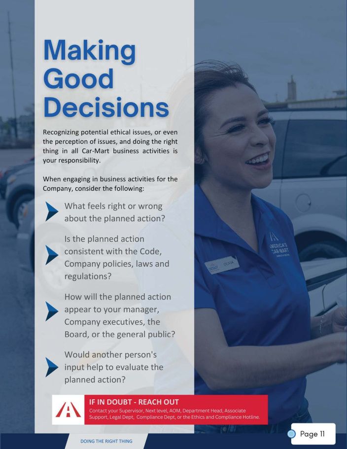 Making Good Decisions Recognizing potential ethical issues, or even the perception of issues, and doing the right thing in all Car - Mart business activities is your responsibility . DOING THE RIGHT THING When engaging in business activities for the Company, consider the following: ► abou t Wha t feel s planne d th e right or action ? wrong Ź Ź Ź Is the planned action consistent with the Code, Company policies, laws and regulations? How will the planned action appear to your manager, Company executives, the Board, or the general public? Would another person's input help to evaluate the planned action? Page 11
