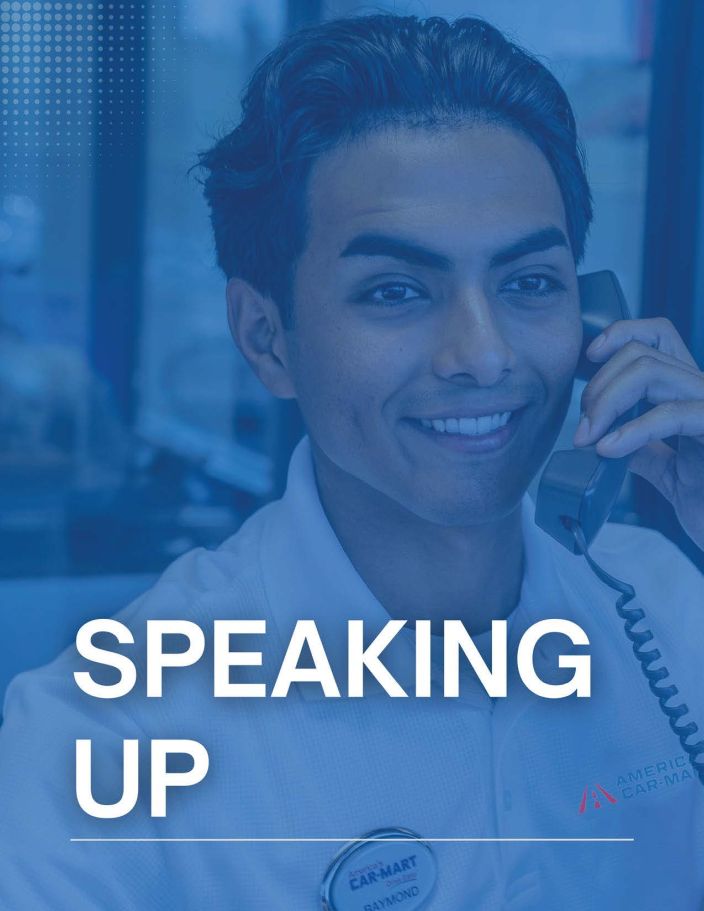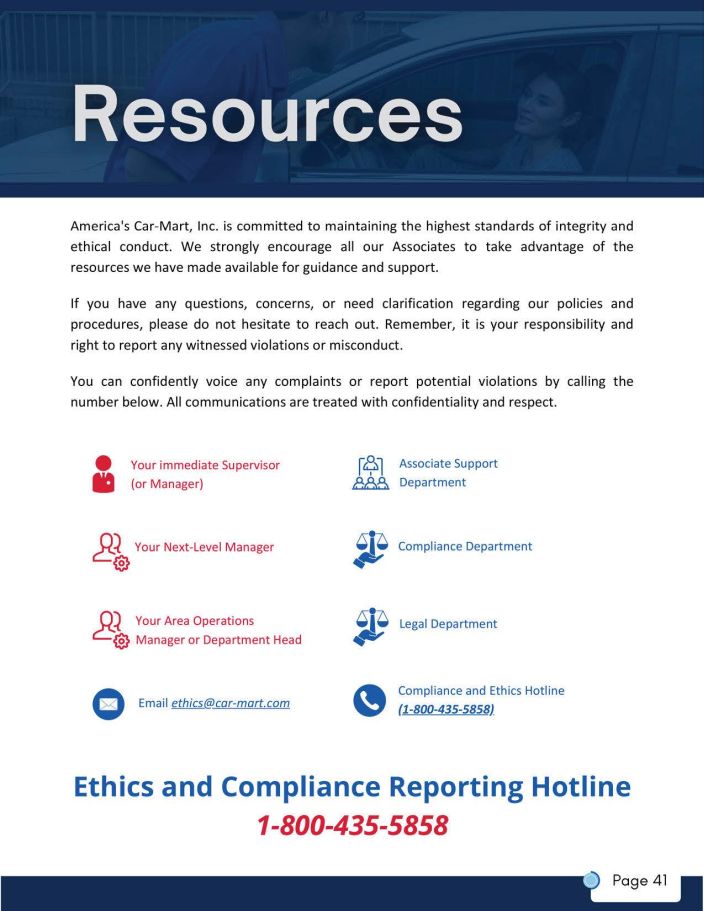 America's Car - Mart, Inc . is committed to maintaining the highest standards of integrity and ethical conduct . We strongly encourage all our Associates to take advantage of the resources we have made available for guidance and support . If you have any questions, concerns, or need clarification regarding our policies and procedures, please do not hesitate to reach out . Remember, it is your responsibility and right to report any witnessed violations or misconduct . You can confidently voice any complaints or report potential violations by calling the number below . All communications are treated with confidentiality and respect . • Your immediate Supervisor ID (or Manager) 2) Your Next - Level Manager @ 2 Your Area Operations @ Manager or Department Head e Email ethics@car - mart.com l l Associate Support Ma Department Compliance Department Legal Department Compliance and Ethics Hotline (1 - 800 - 435 - 5858) . Ethics and Compliance Reporting Hotline 1 - 800 - 435 - 5858 Page 41