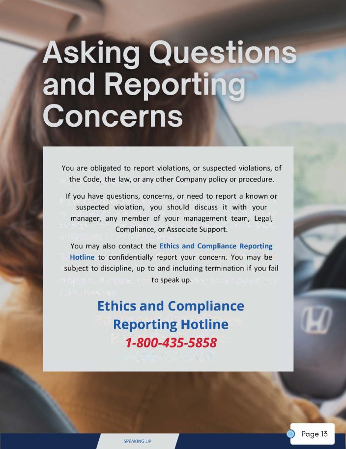 You are obligated to report violations, or suspected violations, of the Code, the law, or any other Company policy or procedure. If you have questions, concerns, or need to report a known or suspected violation, you should discuss it with your manager, any member of your management team, Legal, Compliance, or Associate Support. You may also contact the Ethics and Compliance Reporting Hotline to confidentially report your concern. You may be subject to discipline, up to and including termination if you fail to speak up. Ethics and Compliance Reporting Hotline 1 - 800 - 435 - 5858 SPEAKING UP Pagel3