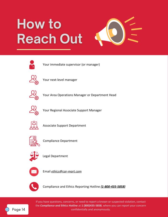 I • I Your immediate supervisor (or manager) Your next - level manager Your Area Operations Manager or Department Head Your Regional Associate Support Manager Associate Support Department Compliance Department Legal Department Email ethics@car - mart.com Compliance and Ethics Reporting Hotline {1 - 800 - 435 - 5858} 1111 Page14 If you have questions, concerns, or need to report a known or suspected violation, contact the Compliance and Ethics Hotline at 1 {800)435 - 5858, where you can report your concern and anonymously. confidentially