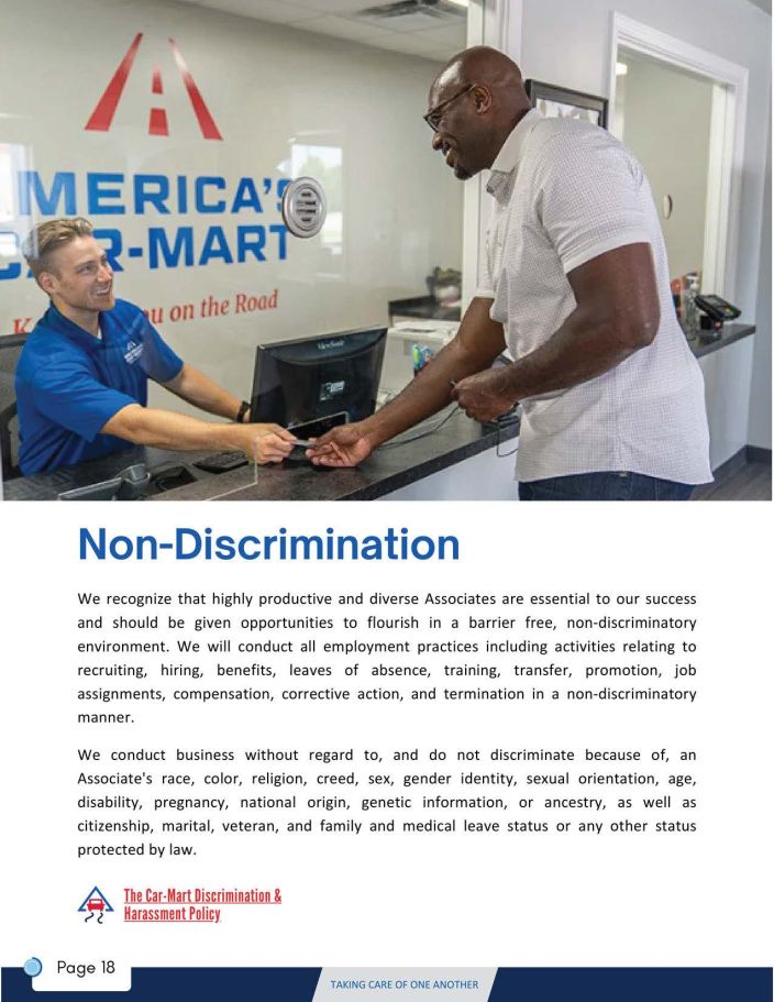 Non - Discrimination TAKING CARE OF ONE ANOTHER We recognize that highly productive and diverse Associates are essential to our success and should be given opportunities to flourish in a barrier free, non - discriminatory environment . We will conduct all employment practices including activities relating to recruiting, hiring, benefits, leaves of absence, training, transfer, promotion, job assignments, compensation, corrective action, and termination in a non - discriminatory manner . We conduct business without regard to, and do not discriminate because of, an Associate's race, color, religion, creed, sex, gender identity, sexual orientation, age, disability, pregnancy, national origin, genetic information, or ancestry, as well as citizenship, marital, veteran, and family and medical leave status or any other status protected by law . A The Car - Mart Discrimination & t - >, Harassment Policy _ Page18