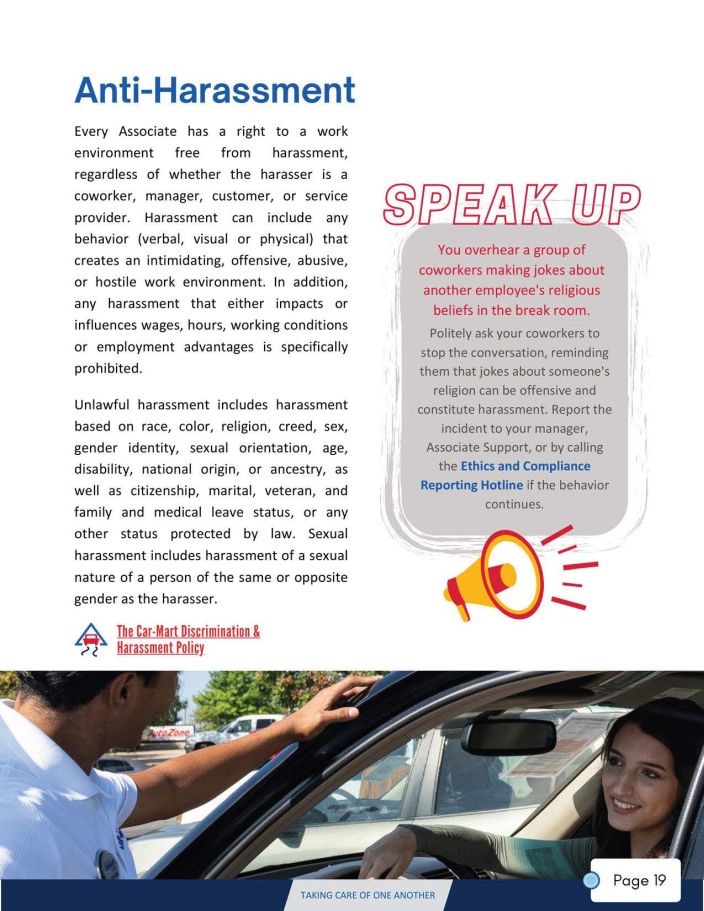 Anti - Harassment Every Associate has a right to a work environment free from harassment, TAKING CARE OF ONE ANOTHER of whether the harasser is a manager , customer, or service regardless coworker, provider . Harassment can include any behavior (verbal, v i sual or physical) that creates an intimidating, offensive, abusive, or hostile work env i ronment . In addition, any harassment that either impacts or influences wages, hours, working conditions or employment advantages is specifically proh i bited . Unlawful harassment includes harassment based on race, color, religion, creed, sex, gender identity, sexua l orientation, age, disability, national or i gin, or ancestry, as well as citizenship, marital, veteran, and fami l y and medica l leave status, or any other status protected by law . Sexual harassment incl u des harassment of a sexual nature of a person of the same or opposite gender as the harasser . A The Car - Mart Discrimination & "'l. Harassment Policy _ @[f J &!i J [J I [}jJ[fJ You overhear a group of coworkers making jokes about another employee's religious beliefs in the break room. Politely ask your coworkers to stop the conversation, reminding them that jokes about someone's religion can be offensive and constitute harassment. Report the incident to your manager, Associate Support, or by calling the Ethics and Compliance Reporting Hotline if the behavior continues. ) - - ......... Pagel9