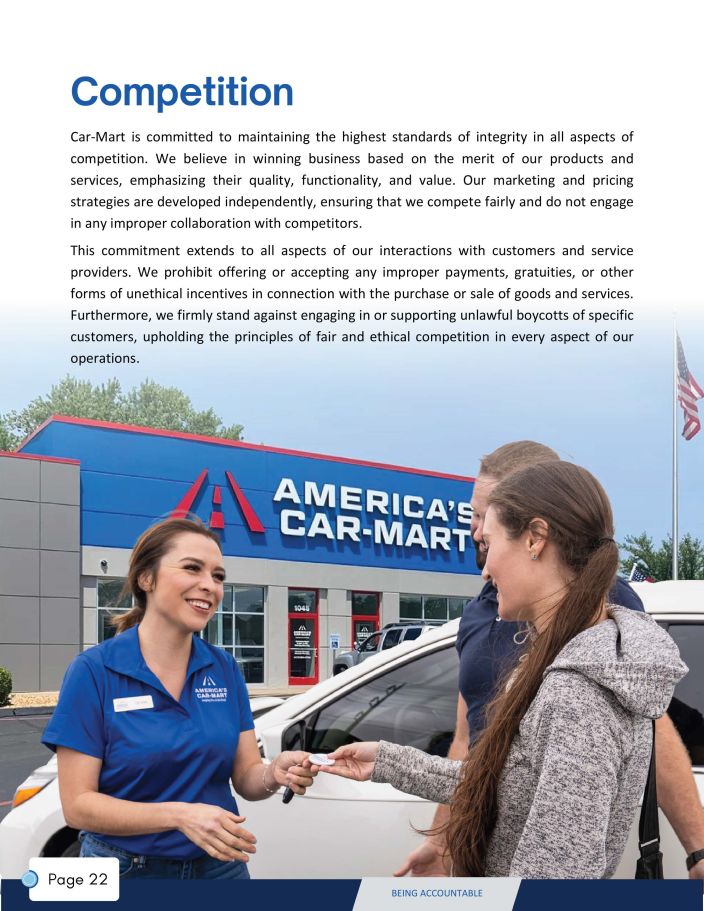 Competition Page 22 BEING ACCOUNTABLE Car - Mart is committed to maintaining the highest standards of integrity in all aspects of competition . We believe in winning business based on the merit of our products and services, emphasizing their quality, functionality, and value . Our marketing and pricing strategies are developed independently, ensuring that we compete fairly and do not engage in any improper collaboration with competitors . This commitment extends to all aspects of our interactions with customers and service providers . We prohibit offering or accepting any improper payments, gratuities, or other forms of unethical incentives in connection with the purchase or sale of goods and services . Furthermore, we firmly stand against engaging in or supporting unlawful boycotts of specific customers, upholding the principles of fair and ethical competition in every aspect of our operations .
