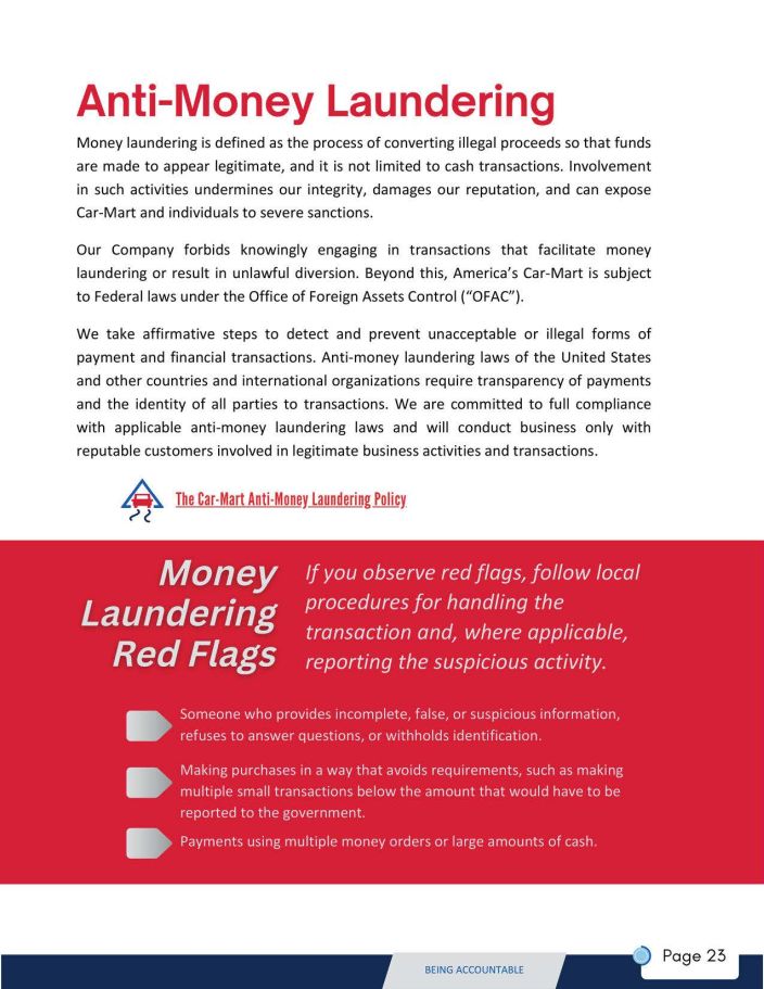 Anti - Money Laundering Money laundering is defined as the process of converting illegal proceeds so that funds are made to appear legitimate, and it is not limited to cash transactions . Involvement in such activities undermines our integrity, damages our reputation, and can expose Car - Mart and individuals to severe sanctions . Our Company forbids knowingly engaging in transactions that facilitate money laundering or result in unlawful diversion . Beyond this, America's Car - Mart is subject to Federal laws under the Office of Foreign Assets Control ("OFAC") . We take affirmative steps to detect and prevent unacceptable or illegal forms of payment and financial transactions . Anti - money laundering laws of the United States and other countries and international organizations require transparency of payments and the identity of all parties to transactions . We are committed to full compliance with applicable anti - money laundering laws and will conduct business only with reputable customers involved in legitimate business activities and transactions . A The Car - Mart Anti - Money Laundering Policy _ l Money laundering Red Flags If you observe red flags, follow local procedures for handling the transaction and, where applicable, reporting the suspicious activity. Someone who provides incomplete, false, or suspicious information, _,,. refuses to answer questions, or withholds identification. _,,. Page 23 BE I NG ACCOUNTABLE Making purchases in a way that avoids requirements, such as making multiple small transactions below the amount that would have to be . reported to the government • Payments using multiple money orders or large amounts of cash.