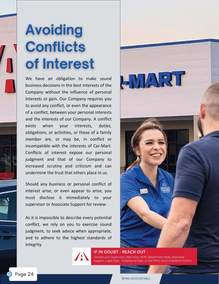 Avoiding Conflicts of Interest Page 24 BE I NG ACCOUNTABLE We have an obligation to make sound business decisions in the best interests of the Company without the influence of personal interests or gain . Our Company requires you to avoid any conflict, or even the appearance of a conflict, between your personal interests and the interests of our Company . A conflict exists when your interests, duties, obligations, or activities, or those of a family member are, or may be, in conflict or incompatible with the interests of Car - Mart . Conflicts of interest expose our personal judgment and that of our Company to increased scrutiny and criticism and can undermine the trust that others place in us . Should any business or personal conflict of interest arise, or even appear to arise, you must disclose it immediately to your supervisor or Associate Support for review . As it is impossible to describe every potential conflict, we rely on you to exercise sound judgment, to seek advice when appropriate, and to adhere to the highest standards of integrity .